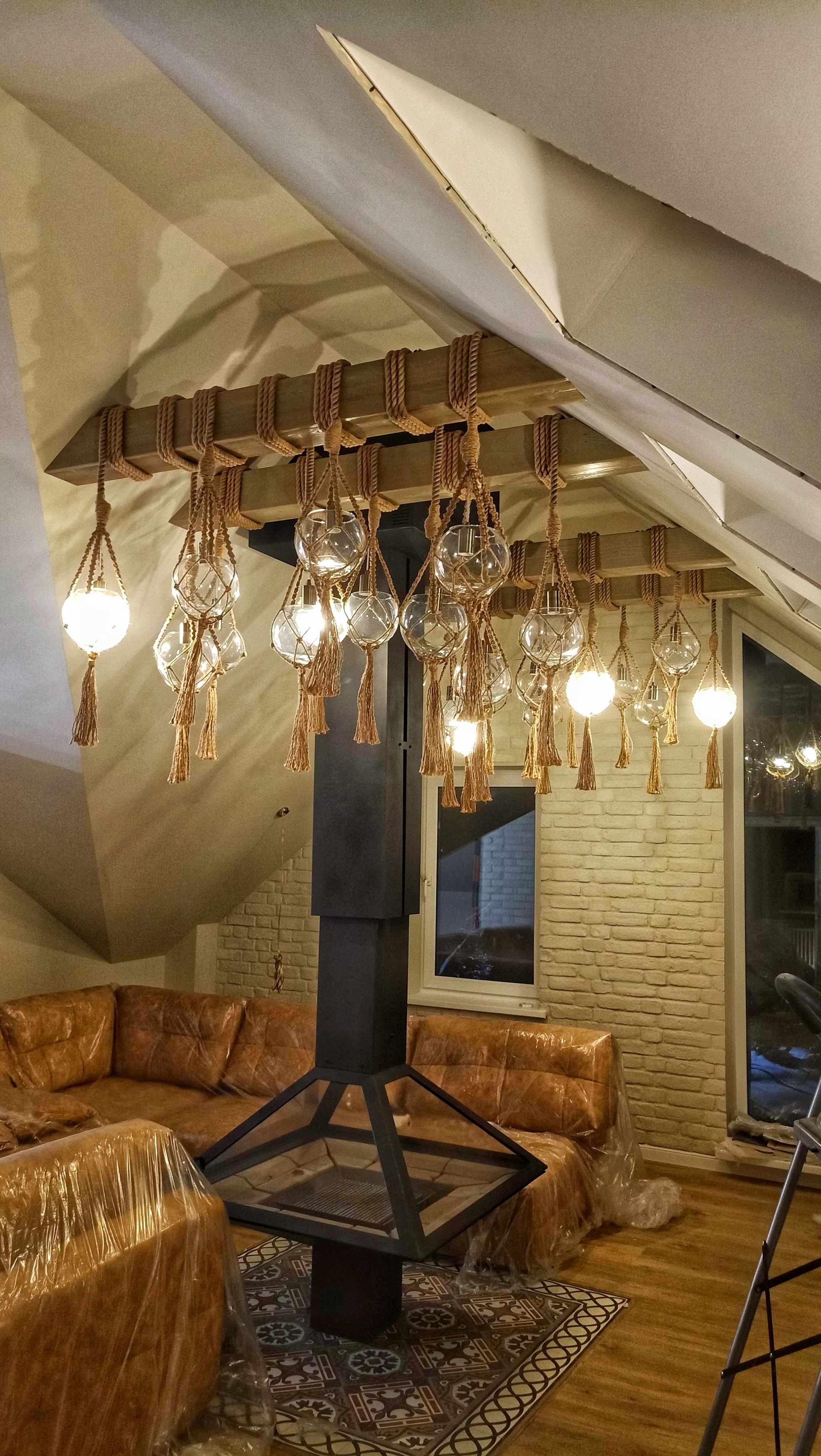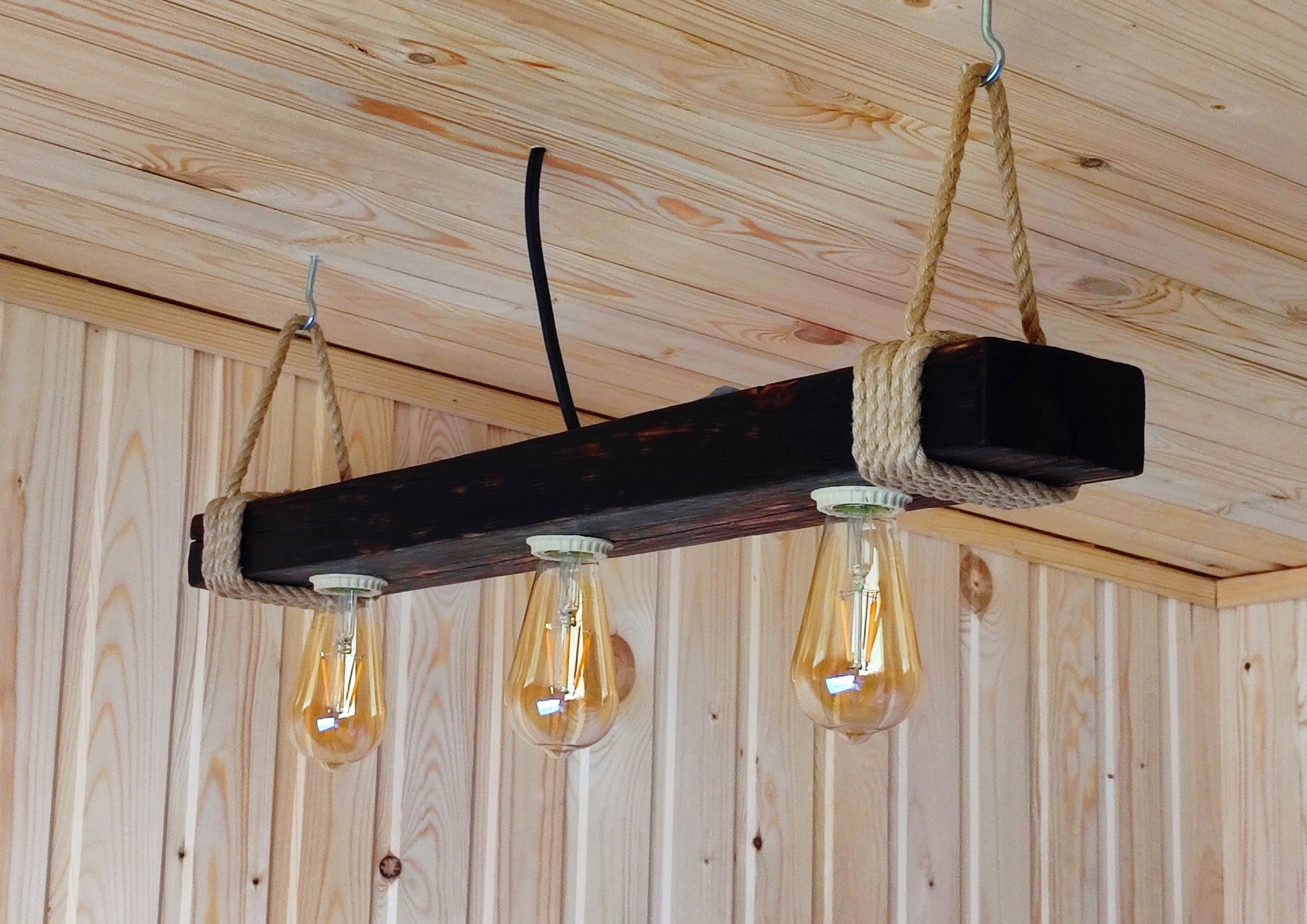 Термоклеем вклеиваю патроны (80 р. за 3 шт.) для для люстры (Е27), их видно на последнем кадре, вверху. Обвязываю пеньковым канатом 8 мм (еще 400 р.), соединяю электрику и вкручиваю лампочки. Смысла считать их (лампочек) стоимость нет, в комплекте они не идут никогда, но я купил их по 200 р/шт.