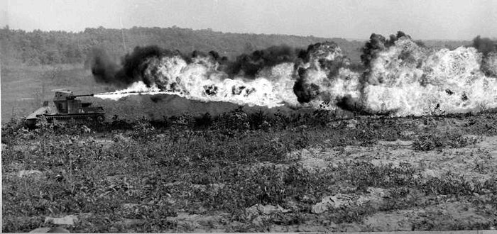 Теперь к нашим котлетам. В 1941 году военные «подрезали» действующий танк М2 (из тех, что построили 18 штук) и вместо пушки установили ему опытный огнемёт Е2. Это было оружие оригинальной конструкции, разработанное для применения на технике.
