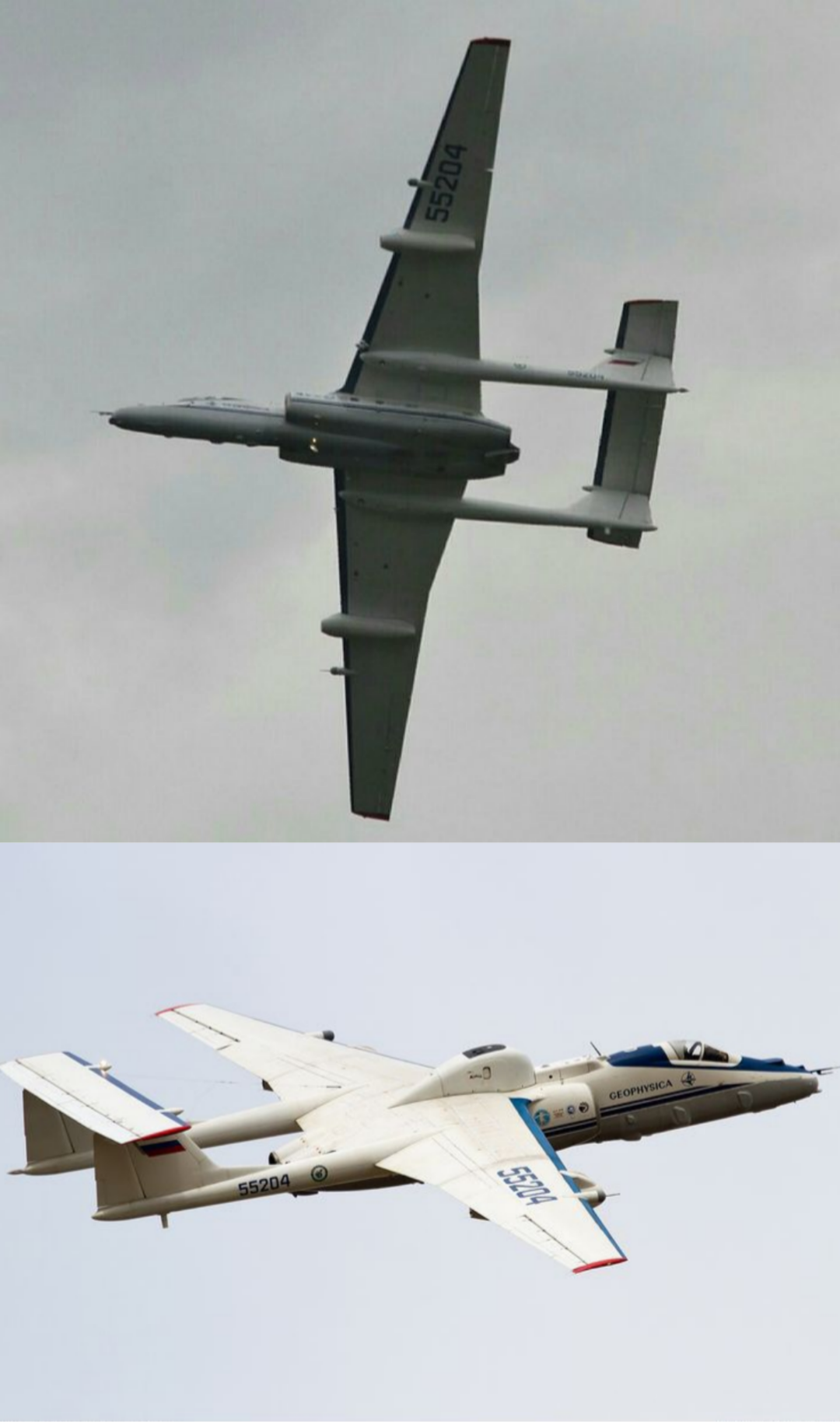 М-55 «Геофизика» – советский, а впоследствии российский высотный дозвуковой разведчик. Был спроектирован и построен по схеме цельнометаллического полумонококового высокоплана, нормальной аэродинамической схемы со свободнонесущим крылом. Со временем самолет стал использоваться исключительно в гражданских целях. Высотный самолет М-55 способен проводить исследования в стратосфере на высотах до 20 км., осуществляя мониторинг воздушной среды, суши, водных бассейнов, а также выступать ретранслятором для обеспечения радио- и телефонной связи. Также на базе М-55 была спроектирована система противоградовой защиты.