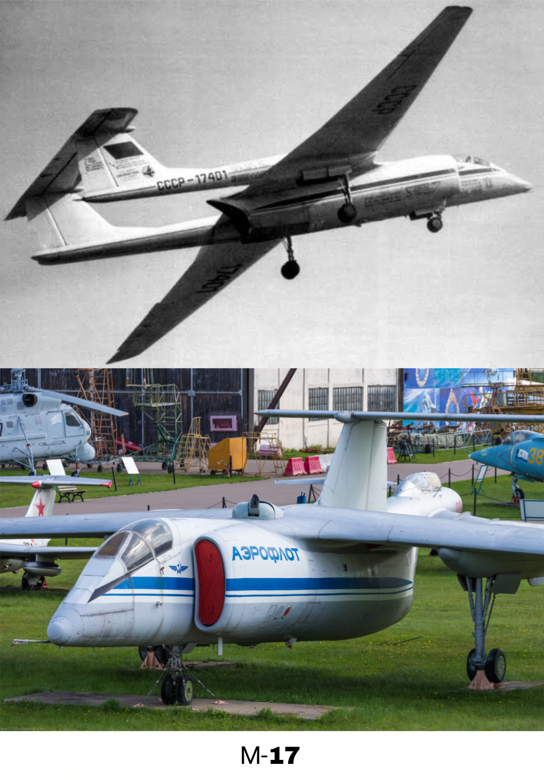 Аэродинамическая компоновка создаваемого высотного истребителя аэростатов, который получил обозначение М-17, была выполнена по достаточно оригинальной двухблочной схеме. В центральной фюзеляжной гондоле самолета находилась кабина летчика, пушечная установка (за кабиной сверху), прицельно-навигационное оборудование, а также силовая установка с боковыми воздухозаборниками. Центральная фюзеляжная гондола заканчивалась соплом двигателя, расположенным на уровне задней кромки высокорасположенного крыла самолета. К консолям крыла примерно на 1/5 их полуразмаха прикреплялись хвостовые балки, которые были связаны между собой П-образным хвостовым оперением. Передняя опора шасси самолета убиралась в специальный отсек в центральной части фюзеляжа, а основные стойки шасси – в отсеки хвостовых балок.