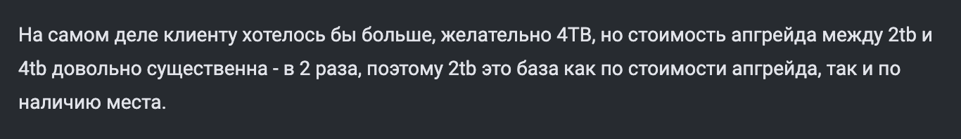 На самом деле клиенту хотелось бы больше, желательно 4TB, но стоимость апгрейда между 2tb и 4tb довольно существенна - в 2 раза, поэтому 2tb это база как по стоимости апгрейда, так и по наличию места.