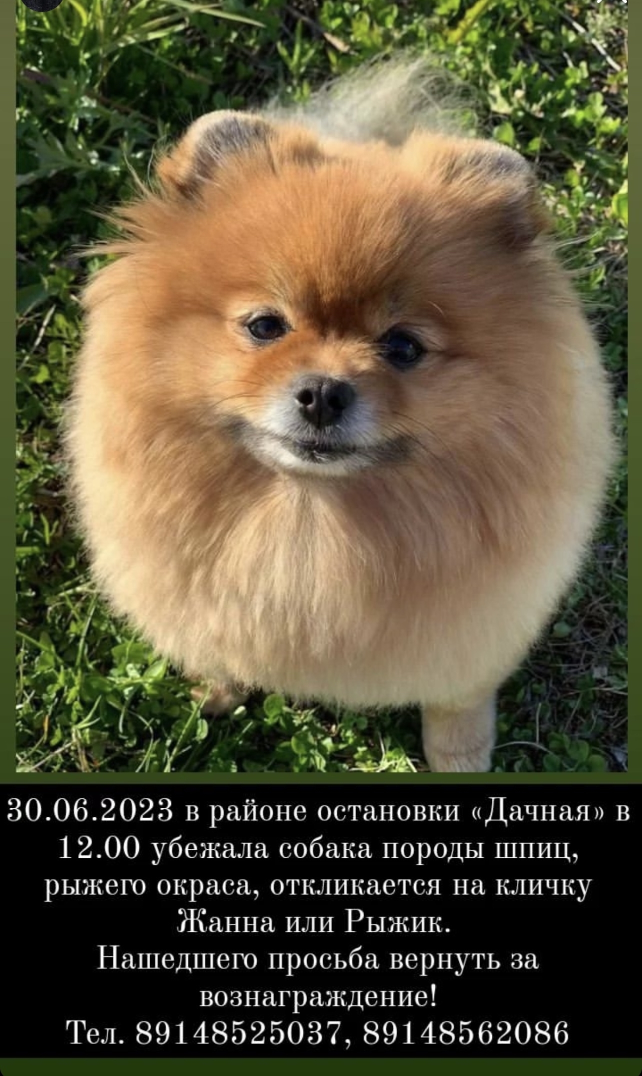 В общем, 30 июня, в 12.20, в районе остановки Дачная, что по дороге на Веселую, убежала вот эта вот хитрая морда. Известно, что в 12.20 на той же остановке ее подобрал некий мужчина не установленного возраста, в белой футболке и черных шортах - имеется видеозапись, но качество съели шакалы.