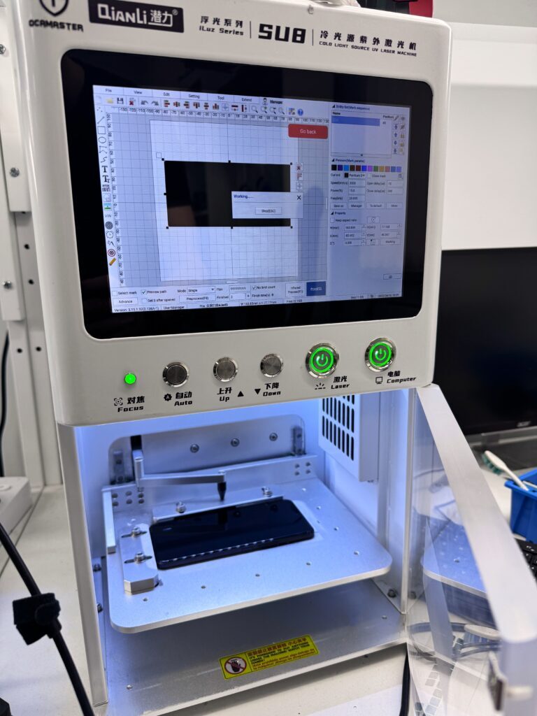 Лазер сжигает только краску не повреждая саму матрицу, чтобы легко можно было завести струну и вытащить герметик, который китайцы тонной налили между дисплеем и рамкой.