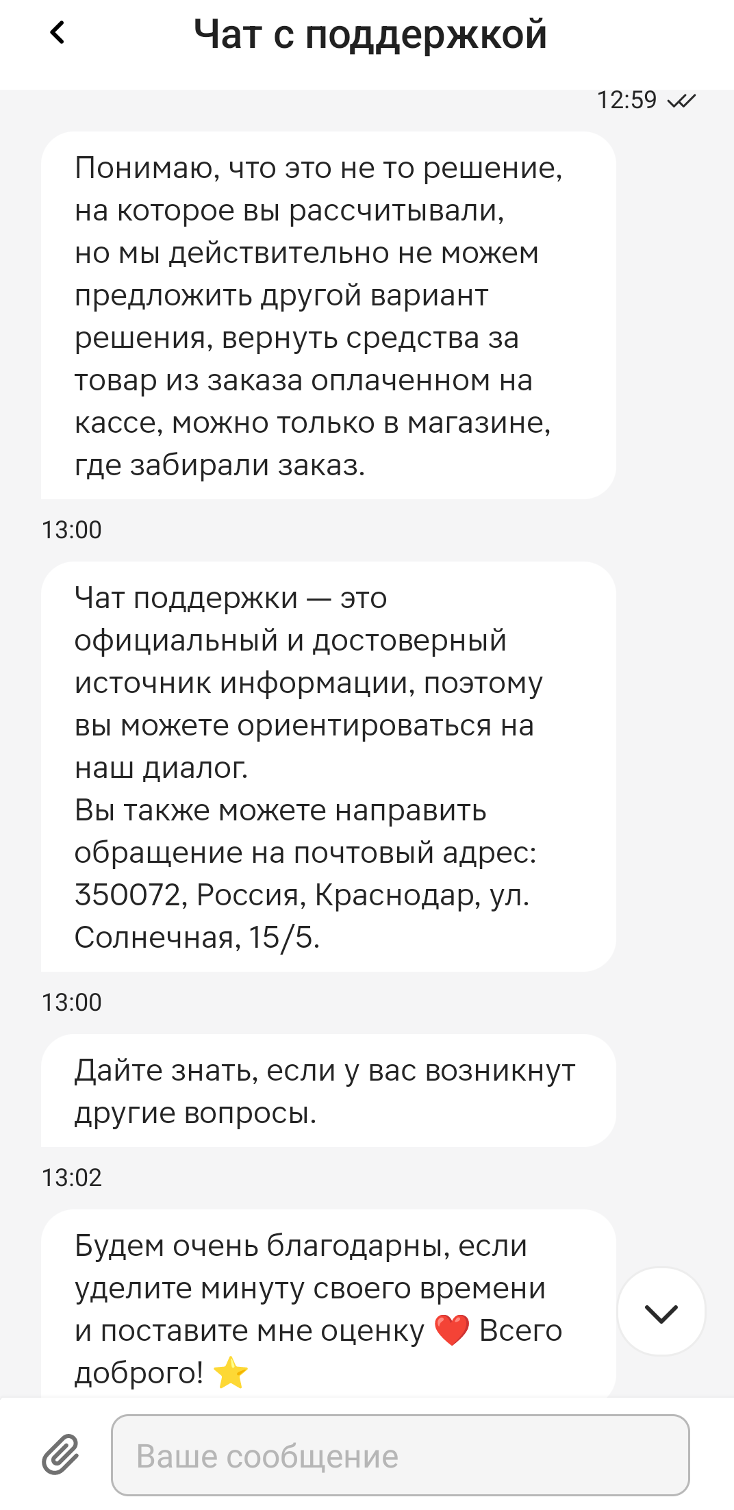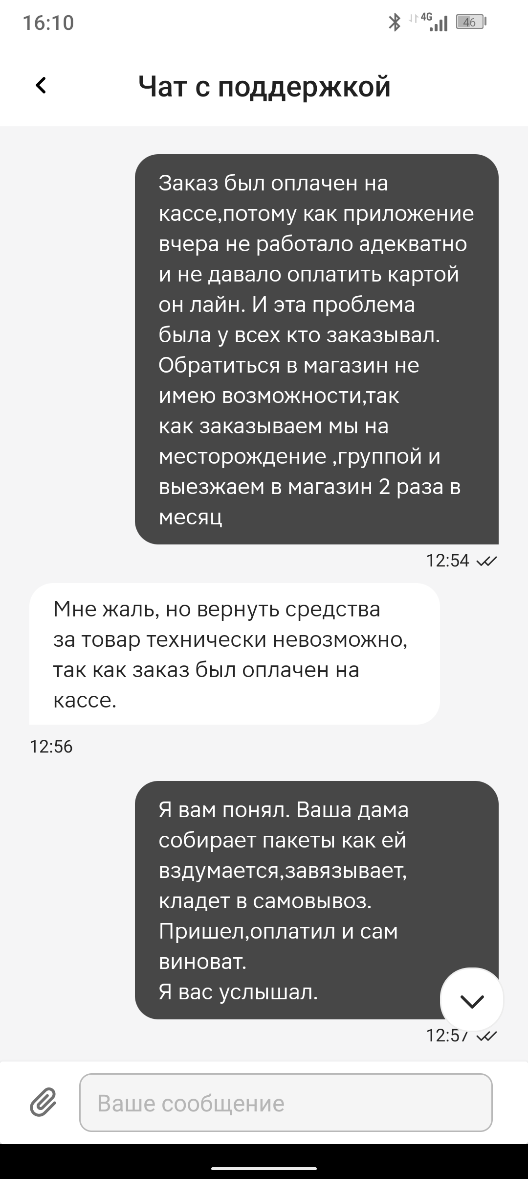 Делать нечего, переводили человеку деньги, он оплачивал заказы на кассе,забирал собранные и завязанные пакеты и грузил в машину. По прибытии , у многих выяснилось,что отсутствуют часть заказа в пакетах. В моем случае 4 салата из моркови со спаржей. В чеке они есть, они оплачены, но они фактически отсутствуют. Обращение в поддержку ни к чему не привело. Если раньше продавец забывал отдавать часть заказа,то его находили и покупателю возвращали разницу. А тут ,со слов поддержки,так как заказ оплачен на кассе,обращаться нужно в магазин. Слова, что в данном магазине нет возможности появиться и что заказ был оплачен на кассе,только из-за некорректно работающего приложения, не возымели никакого результата. И вот сижу я и думаю. Обманули частично примерно 10 человек. Все, ввиду невозможности оплаты онлайн, переводили деньги человеку и он оплачивал заказы. Естественно мы не имеем возможности бросить работу, сесть толпой в машину и за 150 км махнуть разбираться и потому назрел вопрос. Продавцы прекрасно чюут что заказывают вахтовики. Заказы сыпятся один за одним. Также уверен они знали и о некорректной работе приложения и видели оплату на кассе и прекрасно понимают,что через поддержку в таком случае вопросов не решить. Так же они знают, что у вахтовиков нет возможности ехать в такую даль и разбираться за каждые отсутствующие позиции и потому назрел резонный вопрос. А не стащили ли упаковщики часть заказа для себя любимого? @Magnit.dostavka,какие будут комментарии? Для себя решил,раз такая песня,в вашей сети больше не заказывать.Благо,альтернативы вдоволь. Это как в старой загадке, а можно ли наебать хохла? Можно но 1 раз.