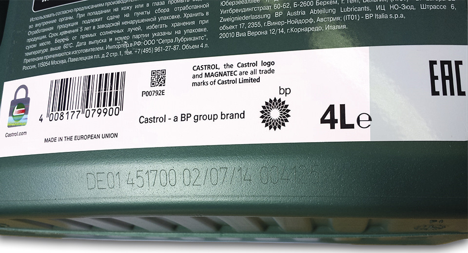 я на проверочный код не смотрю и замочек, потому что на подделке из яндекса они тоже были а канистра сделана из мягкого пластика аж двумя пальцами сплющиваешь, у магнитовской написал же что канистра сделана по канонам кастрола, стыковка пресформ возле горлышка, и на днище возле кода, разница в дате производство тары и масла не превышает 2 месяца, все на турецком написано, есть какой то проверочный код, только турки код не лазером делают, а тушью точками.