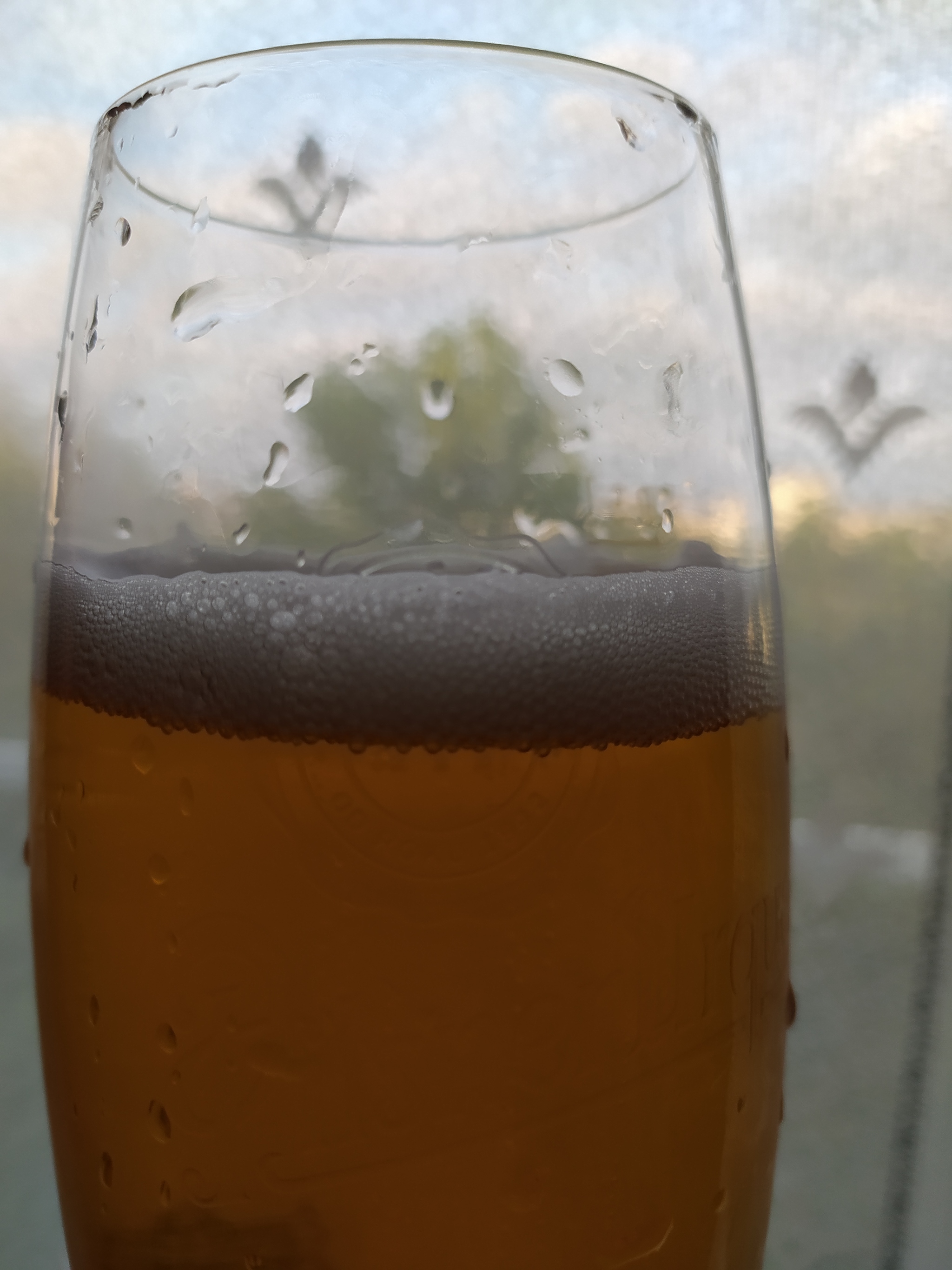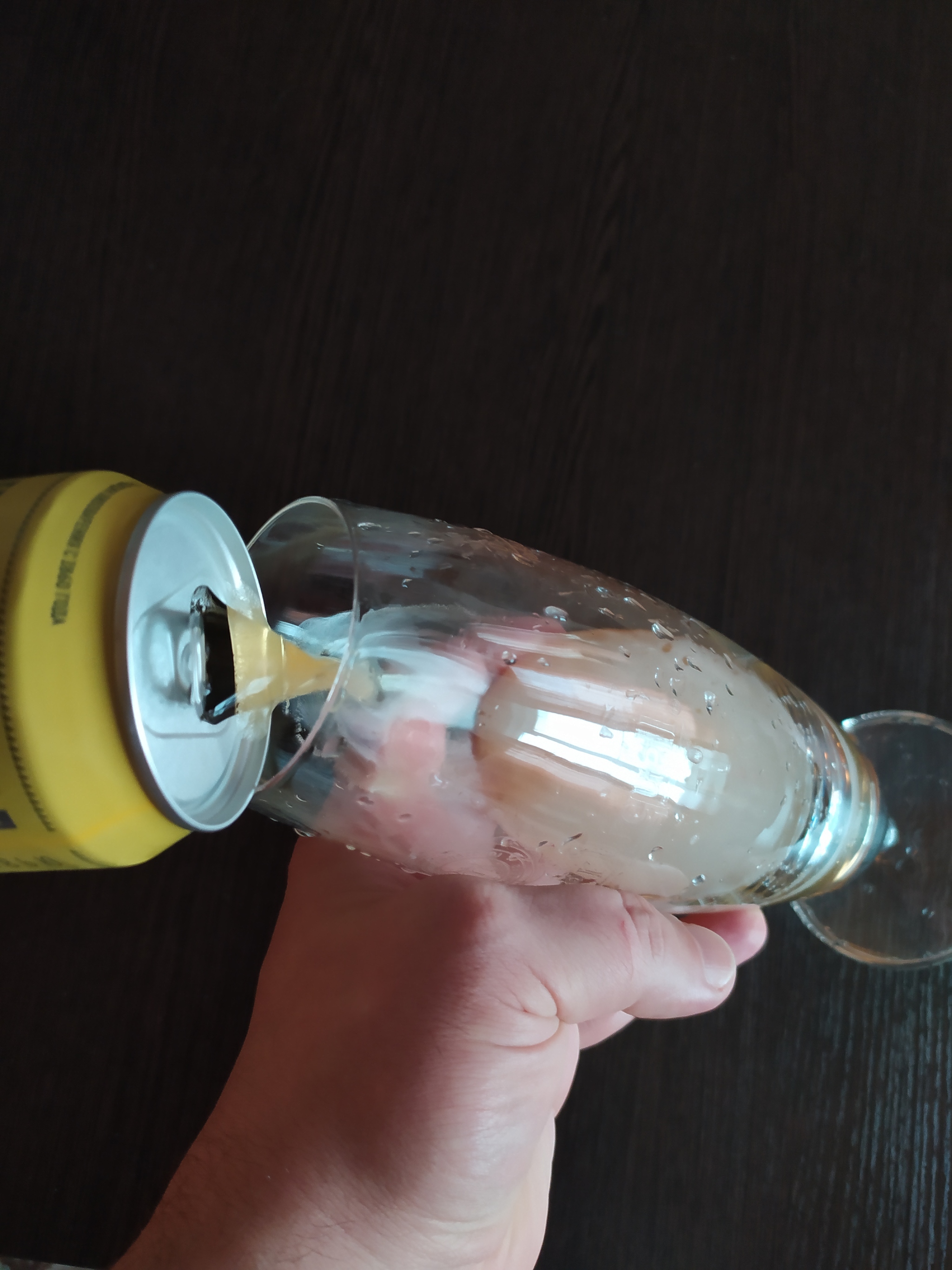 Пена не плотная, много шариков разного размера. Оседает быстро, пены много. Газация очень слабая. Цвет водянисто-янтарный, прозрачный.