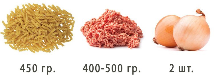 Рецепт состоит всего из 3 главных компонентов это: макароны, мясной фарш или консервы, репчатый лук. Остальное это масло и специи.