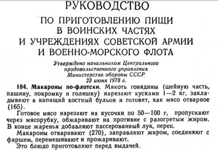 Еще один рецепт нашелся в руководстве по приготовлению пищи в воинских частях и учреждениях Советской Армии и Военно-Морского Флота, от 23 июня 1978 года.