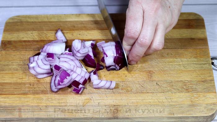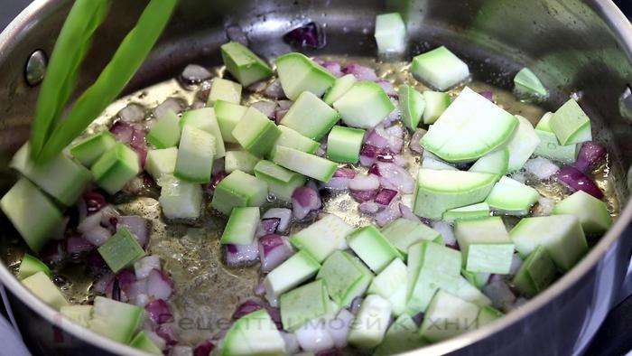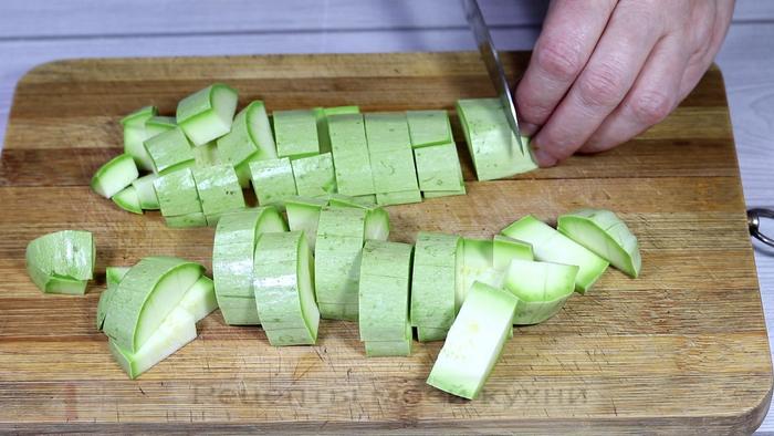 Подготовить овощи. У кабачков удалить плодоножки и хвостики и порезать кубиком.