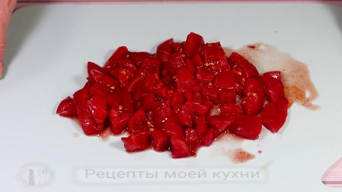 Помидоры очистить от кожуры и нарезать кубиком. Чеснок мелко порубить, а сыр натереть на крупной тёрке.