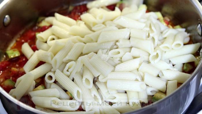 По истечении этого времени к овощам добавить отварные макароны, аккуратно перемешать.