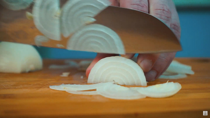 Начинаем с соуса! Возьмем пару луковиц и порежем полукольцами. Дальше измельчаем чесночок.