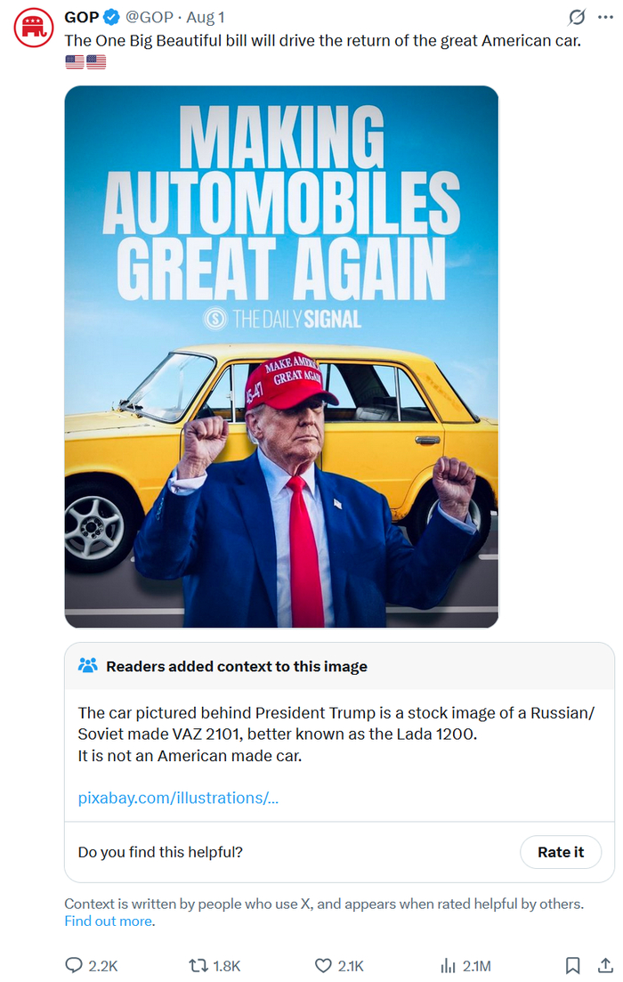 Дорогие друзья, девочки-дизайнерши проблема не только наша. Она такая, повсеместная что ли. Вот в твиттер-аккаунте Республиканской партии США с 3,4 миллионами фолловеров до сих пор висит такое. Предложение сделать автомобили снова потужными.