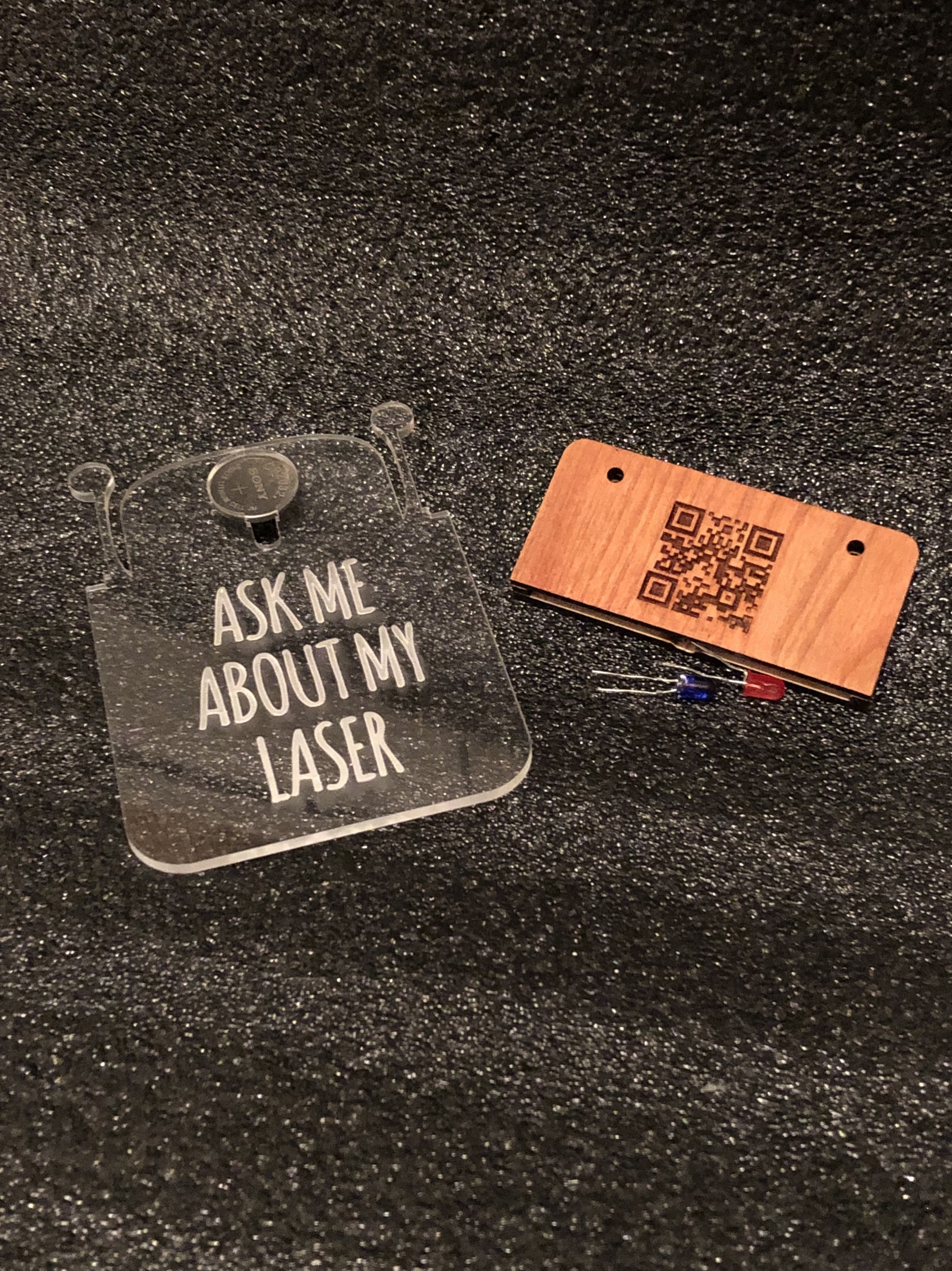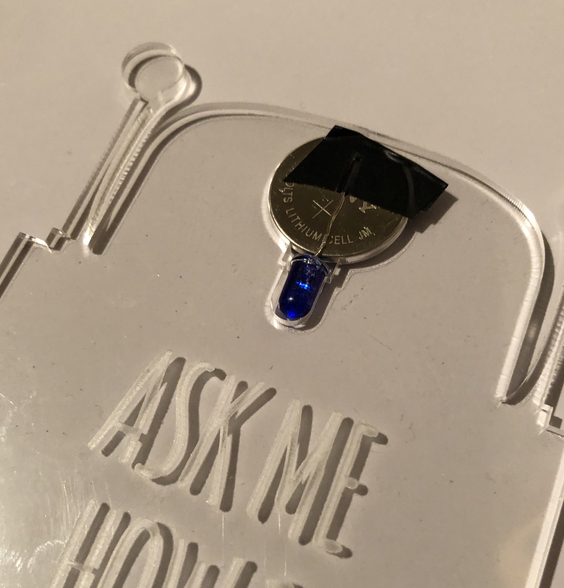 Материалы для изготовления: акрил, фанера, батарейка CR2032 диаметром 20 мм, светодиод 5 мм, клей, бичевка или цепочка.
