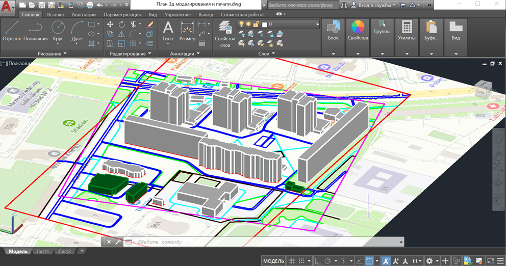 Карта в пиксельном формате и увеличить качественно под размер макета не получится. Поэтому обвели контуры домов и дорог в AutoCAD. Закрасили области зеленым и серым. Делали все в масштабе 1:300, чтобы район поместился на основу 60х60см. Получили подложку.