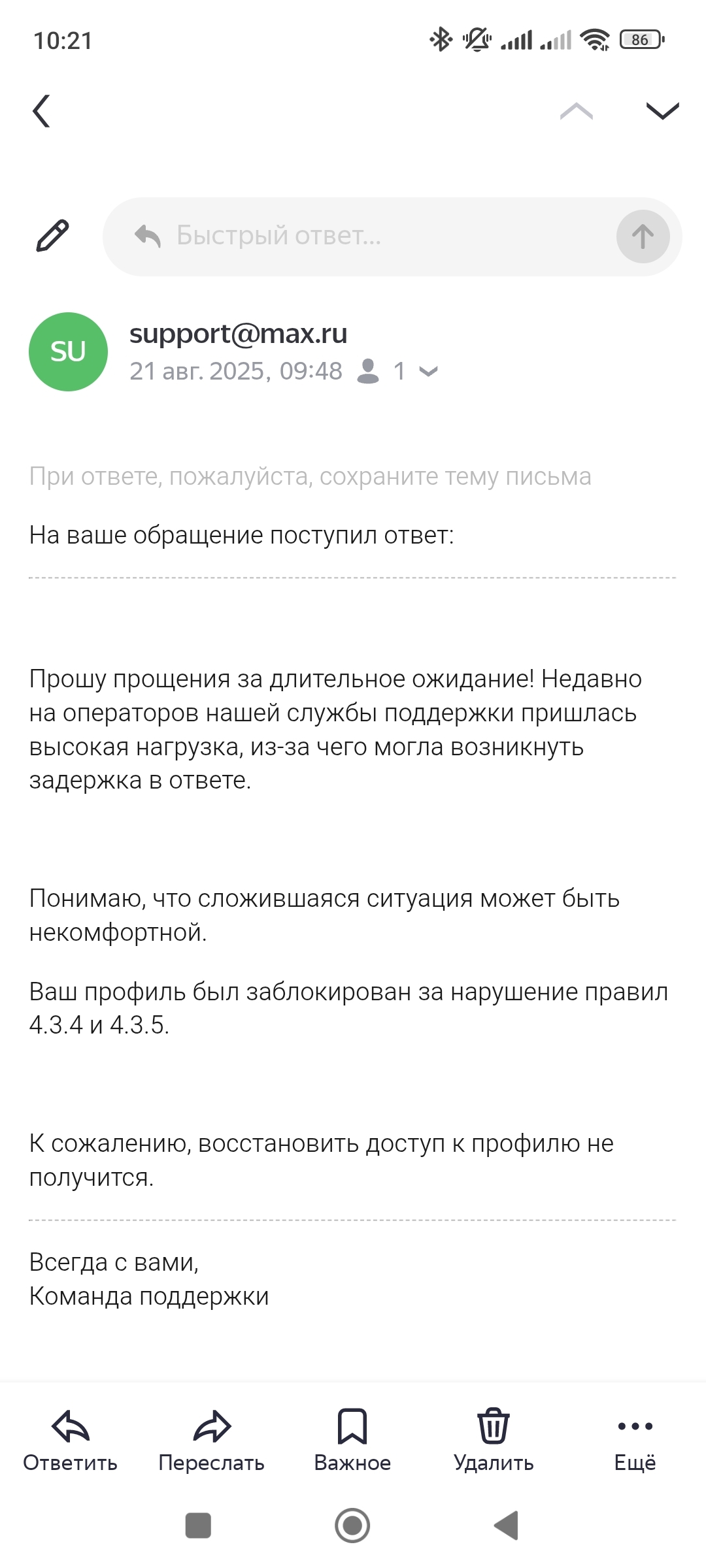Где то месяц назад зарегистрировался в этом месенжере ради интереса. Посмотрел кто из знакомых там есть. На тот момент было всего пару людей по работе. Сим карта мне принадлежит уже лет 10. Так как занимаюсь небольшим производством зарегистрирован ооо и сайт, группа вк. Мой номер телефона хорошо ищется в поисковике. Так же гос услуги привязаны к этому номеру телефона. Ну зарегистрировался и стоит приложение в телефоне. Не заходил туда и никто не писал мне там. А на днях решил посмотреть. Вижу что приложение вышло из аккаунта и решил снова войти. А смс код не приходит. Решил обратиться в поддержку. Номеров нет, звонить некуда. Есть только обращение на почту. Написал им. В итоге оказалось что профиль был заблокирован за нарушение правил 4.3.4 и 4.3.5. внятного ответа я не получил что я такого делал что нарушил эти правила. Из личных соображений. Недавно тут же на Пикабу был пост что в мах заблокировали много аккаунтов мошенников. Скорее всего разработчики взяли с какой то базы номера которые используются мошенниками. В прошлом году мой номер телефона подменным способом использовали мошенники и мне приходили звонки от незнакомых людей что я будь то им звонил. И приходили смс о том что человек появился в сети. Обращался своему оператору, они подтвердили что я им не звонил. Был даже звонок из МВД. Что есть жалоба на мой номер телефона. Я им сказал что бы брали деталировку звонков у оператора связи и что звонки я не совершал. Больше звонков от МВД не было. И вот скорее всего из за этого меня просто заранее заблокировали)). Вот такие дела товарищи)). Скриншот ответа службы поддержки прикладываю.