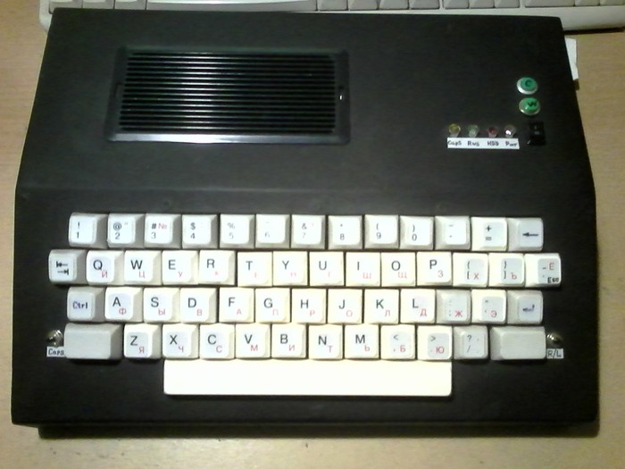 Клавиатура уже оставалась с прежнего проекта, она была немного усовершенствована, чтобы можно было вводить кириллицу в альтернативной кодировке ака СР866, для хотя бы текстовой совместимости с окружающими нас писюками.