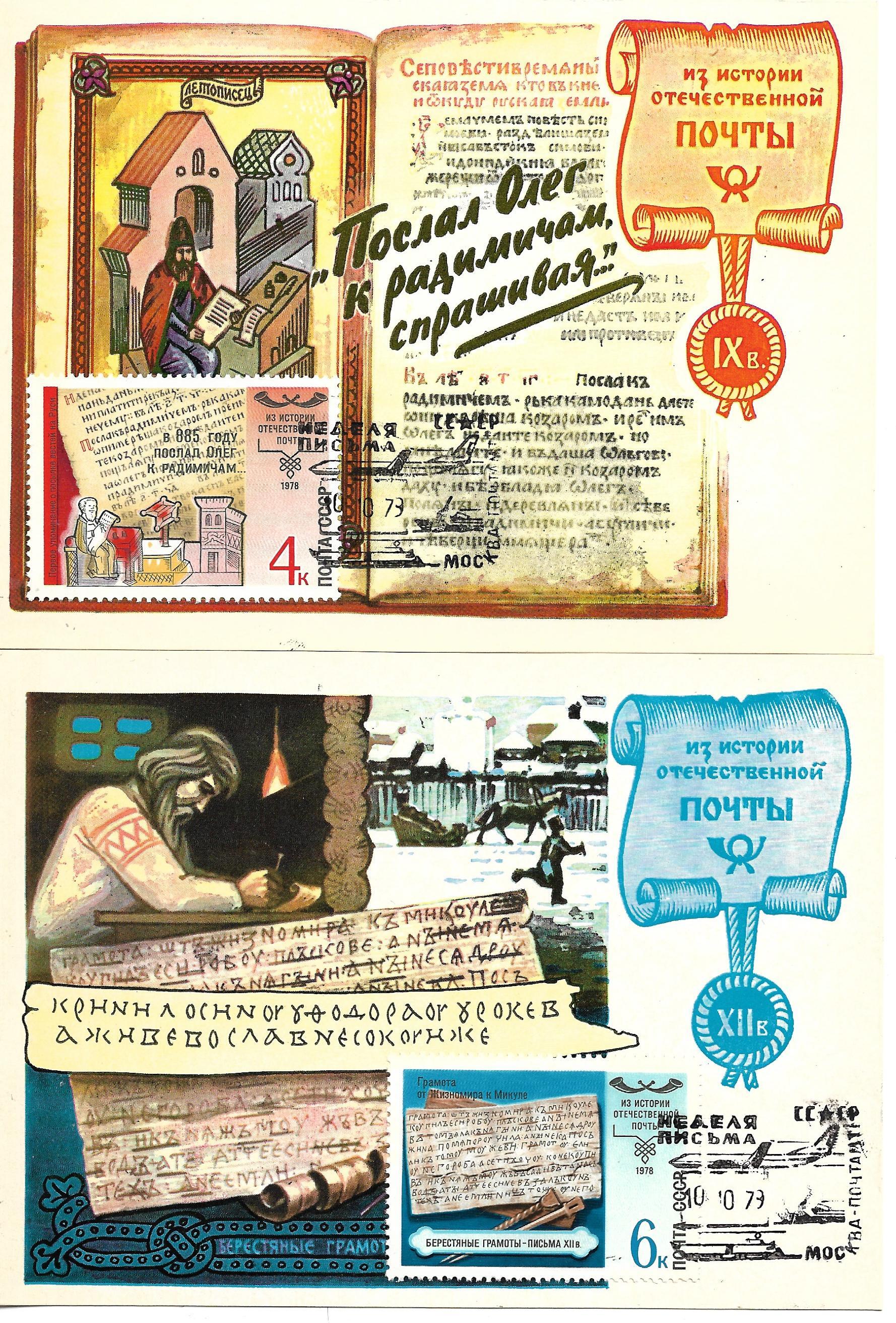 Посмотрим теперь результаты моих попыток. Серия «история почты». Дизайн открыток таков, чтобы можно было сделать картмаксимум. Но, марки большого формата и, в результате, штемпель попал то на задние ноги лошади, то на черный сапог, а то и на текст. Лишь один предмет получился удачно: на открытке с берестяной грамотой. Но, опять нюанс! Типовой штемпель «Неделя письма» годится для марки любой тематики. Это снижает его ценность.