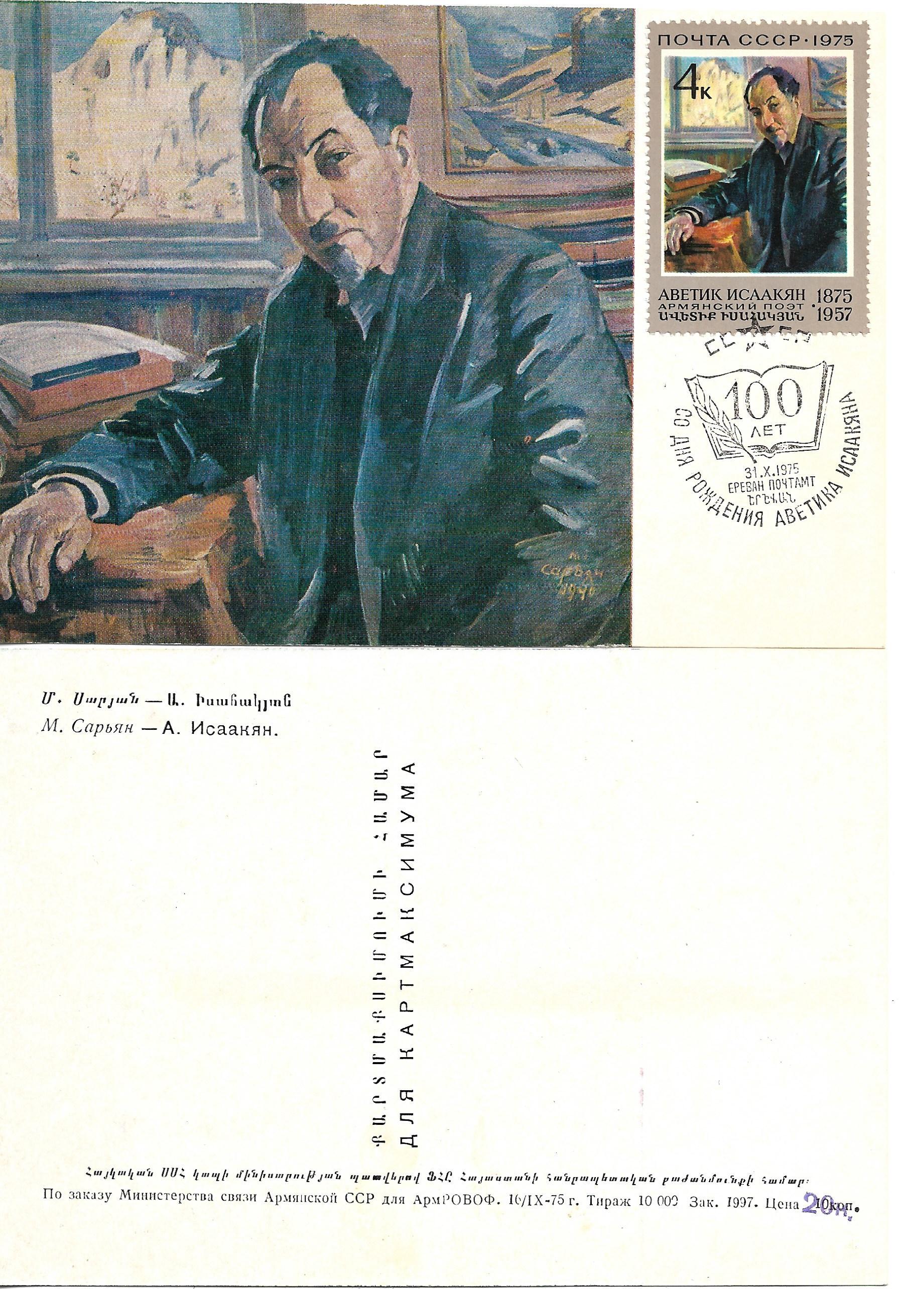 Вполне неплохие, тематически правильные картмаксимумы в честь симпозиума по армянскому искусству. И открытки выпущены специально под размещение марок и штемпеля (белое поле в правой части открытки). Но внешний вид открыток… наверное бледной печатью художник хотел придать им вид чего-то древнего. Не уверен, что это было правильным решением.