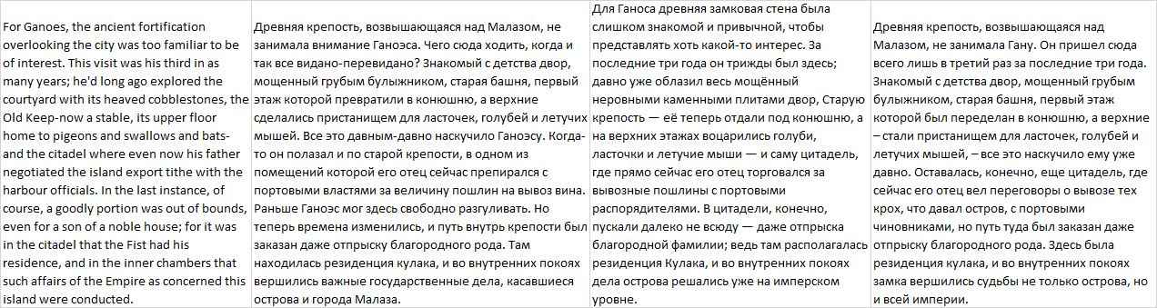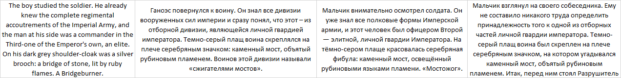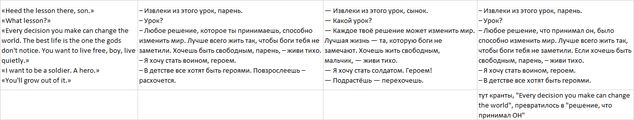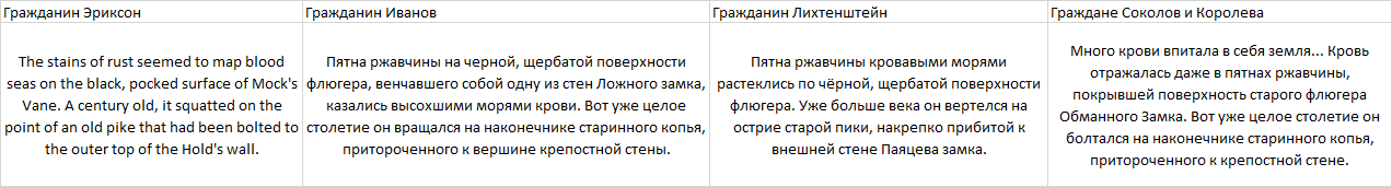Ну не может быть такого, что у одной из лучших книг, попадающей во все топы вот такой язык, сказал себе я и обратился к интернету с вопросом. Оказалось, что злой Bydloman не переводил её, но зато переводили аж 3 раза. Гражданин Иванов (не тот Иванов, что переводил Аберкромби), гражданин Лихтенштейн (не тот, который рыцарь) и граждане Соколов и Королёва. В дальнейшем будем обозначать их как И, Л, и СиК.