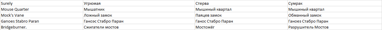Ну и на последок ещё одна табличка с переводом имён собственных