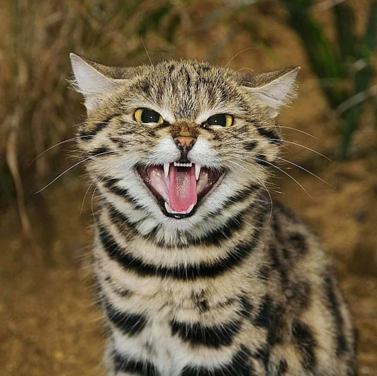 Этот сердитый малыш - черноногая кошка, самая маленькая кошка Африки. Самец весит не больше 2,5 кг, самка - полутора. У него адский метаболизм, за ночь ему нужно поймать 14 каких-нибудь позвоночных: птичек, грызунов, ящериц. При этом он чемпион по эффективности охоты - 60% успеха - это круче чем у леопарда или, тем более, льва или гепарда. Крошечный котик способен подпрыгнуть на метр сорок вверх за своей жертвой. В общем - чемпион.
