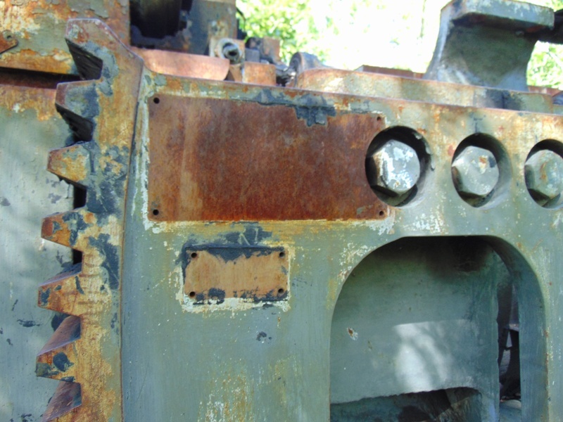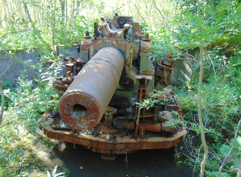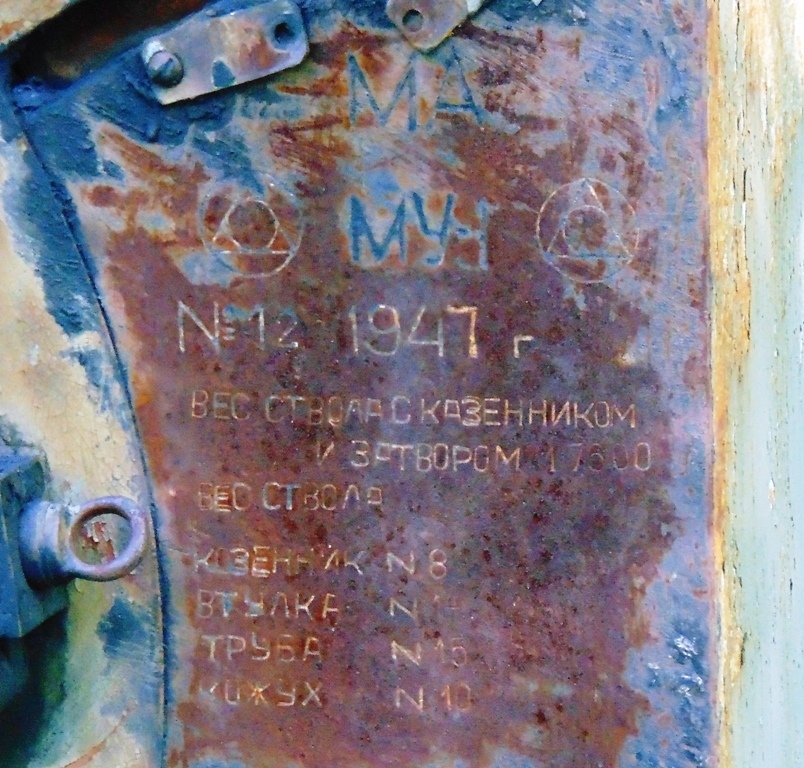 Здесь мы видим орудие № 12. Ствол срезан газосваркой, куда он делся - не известно. Клейма на казённике сохранились хорошо, а вот заводские таблички кто-то снял. Наверное какой-то коллекционер.