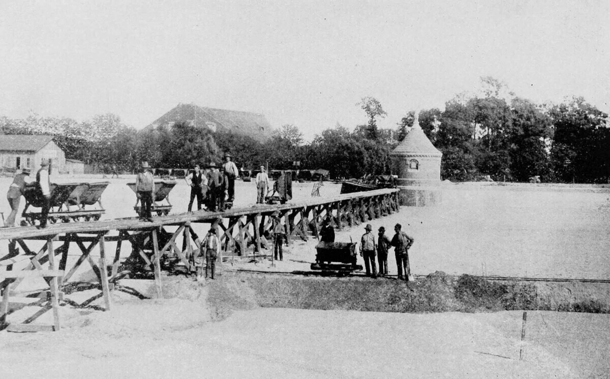 Строительство станций водоподготовки в XIX веке велось максимально простыми способами. На обоих фотографиях строительство песчаных фильтров на станции в Гамбурге.