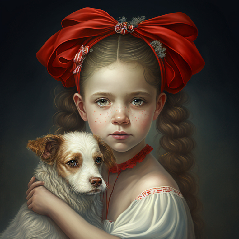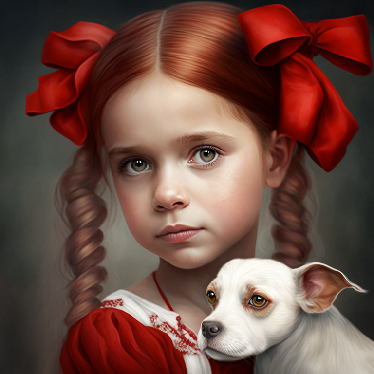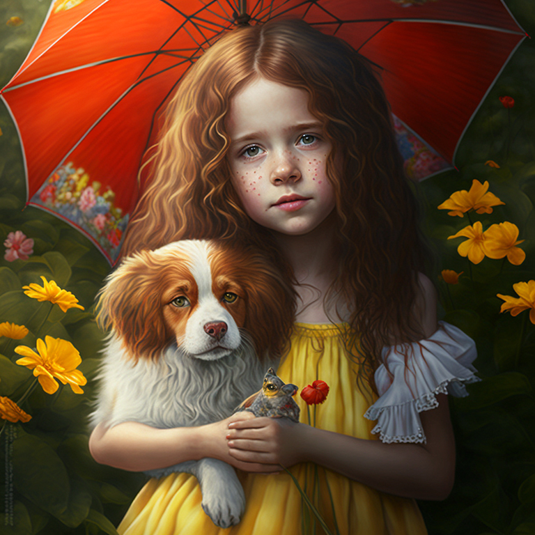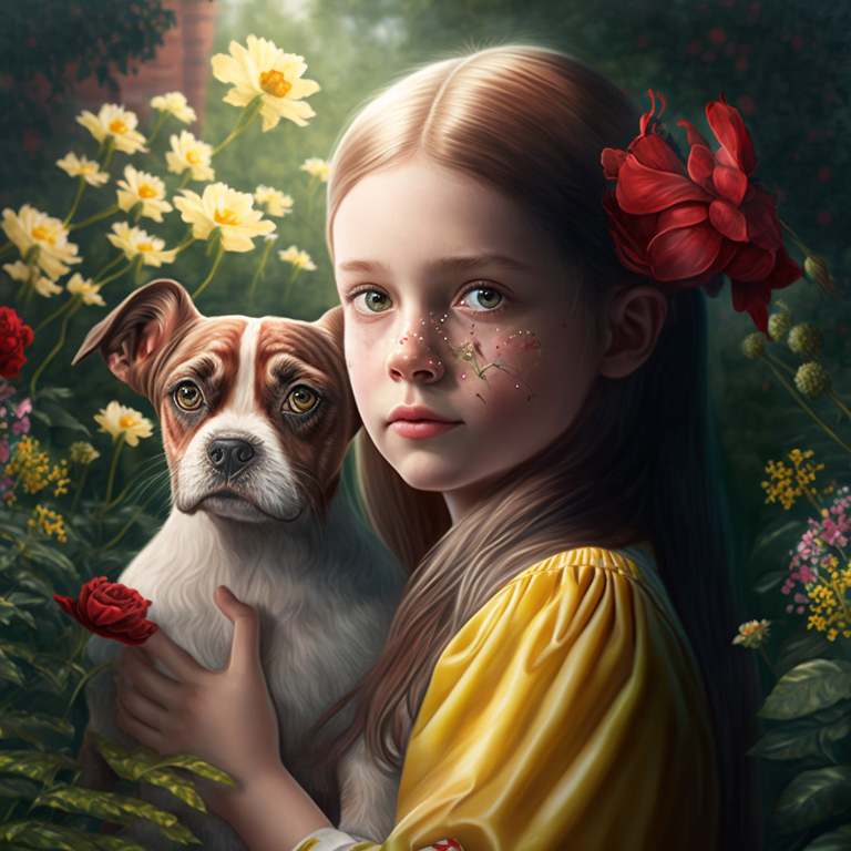 Вариант запроса (промпта): "a little beautiful fantasy girl with a small cute dog in the summer in the garden". Вы можете менять отдельные слова в запросе, чтобы получать разные варианты.