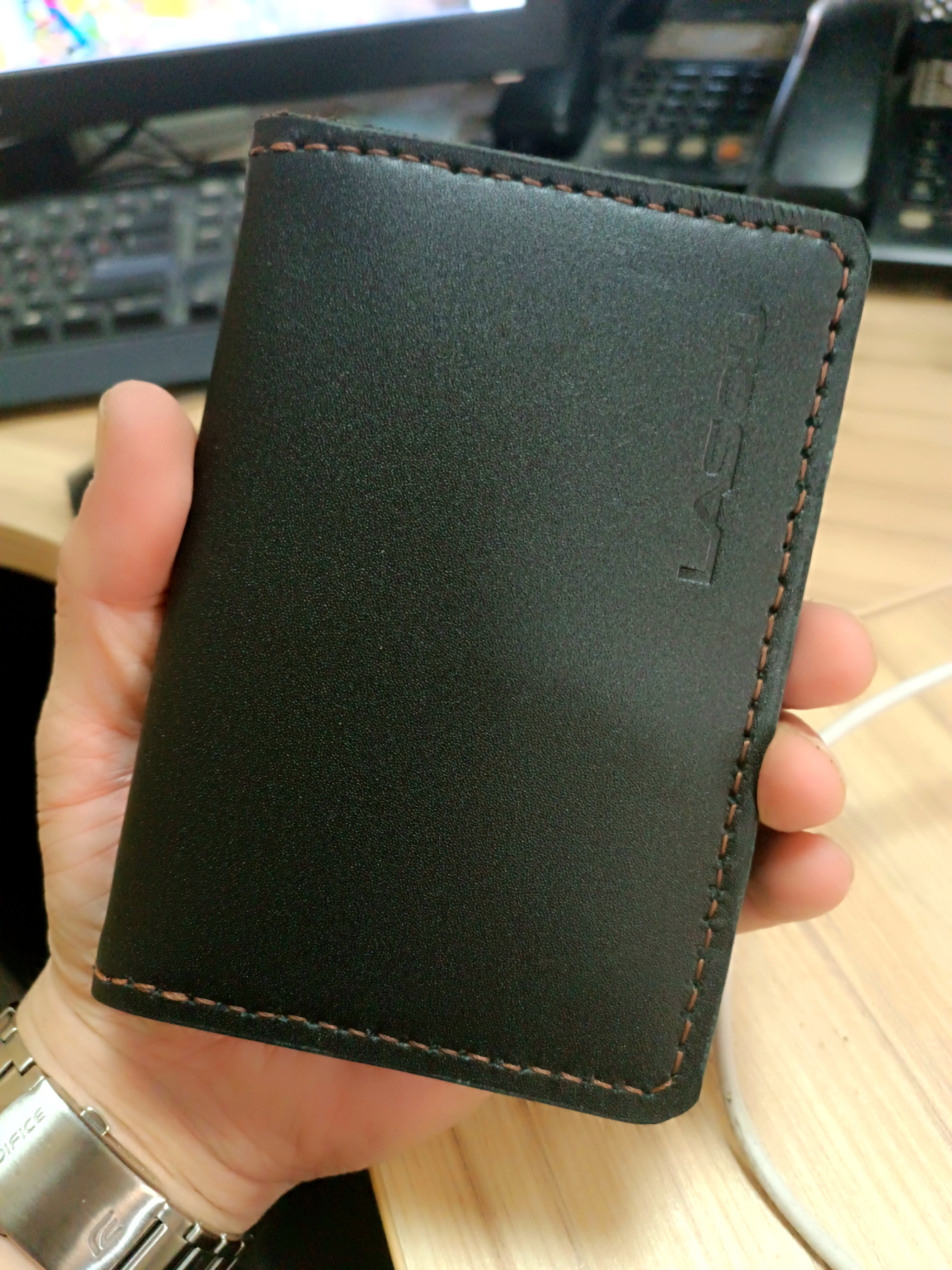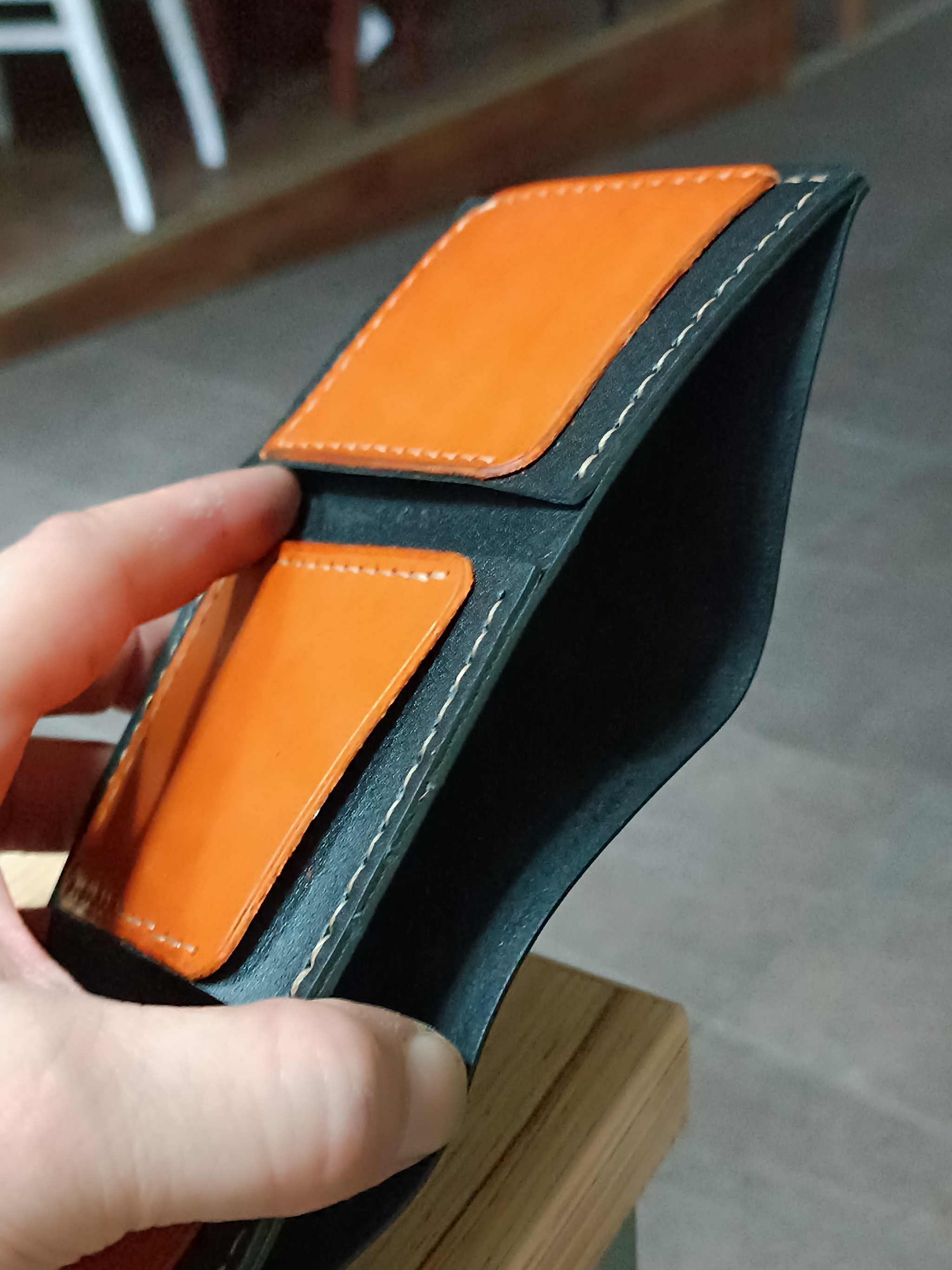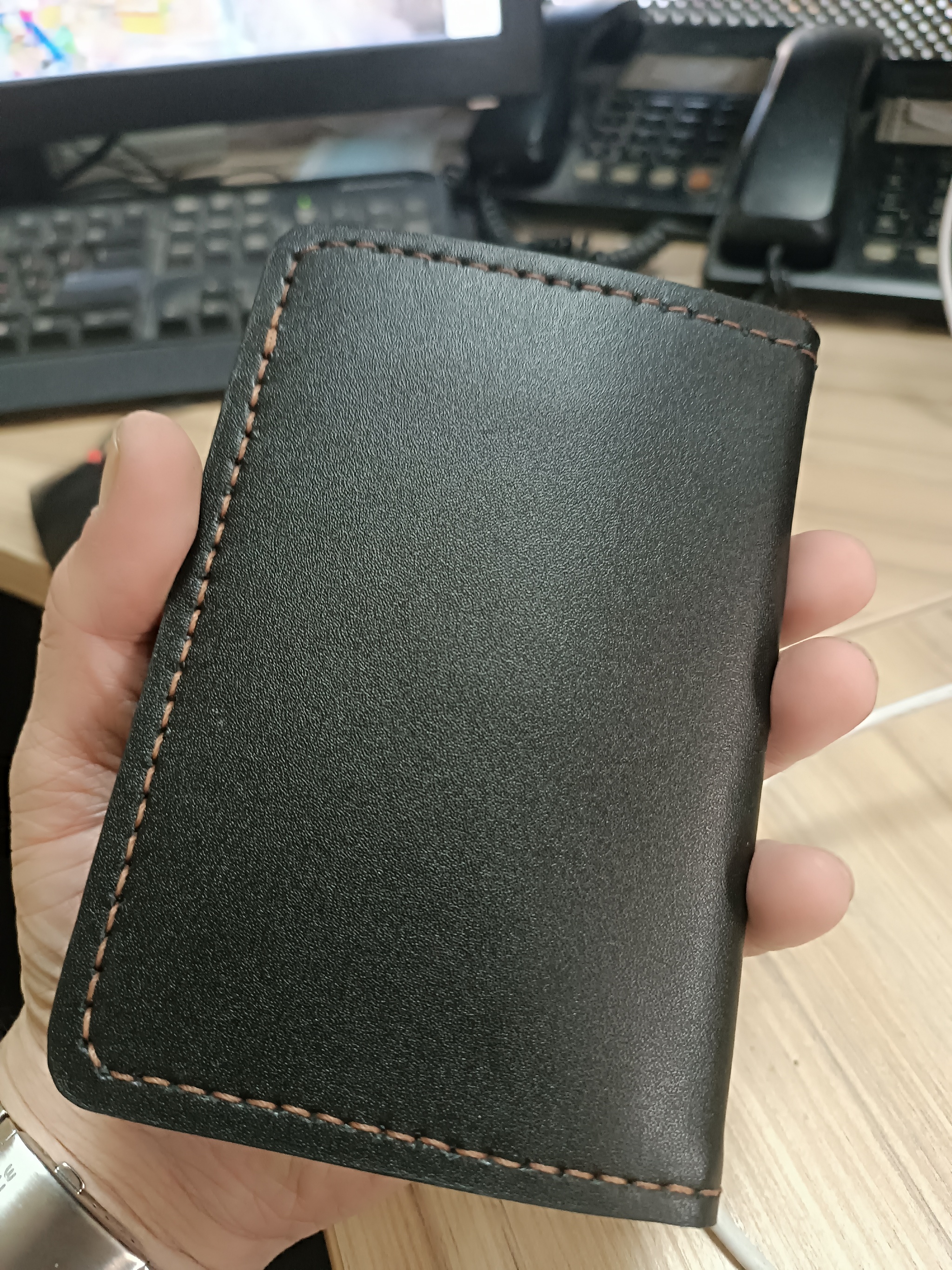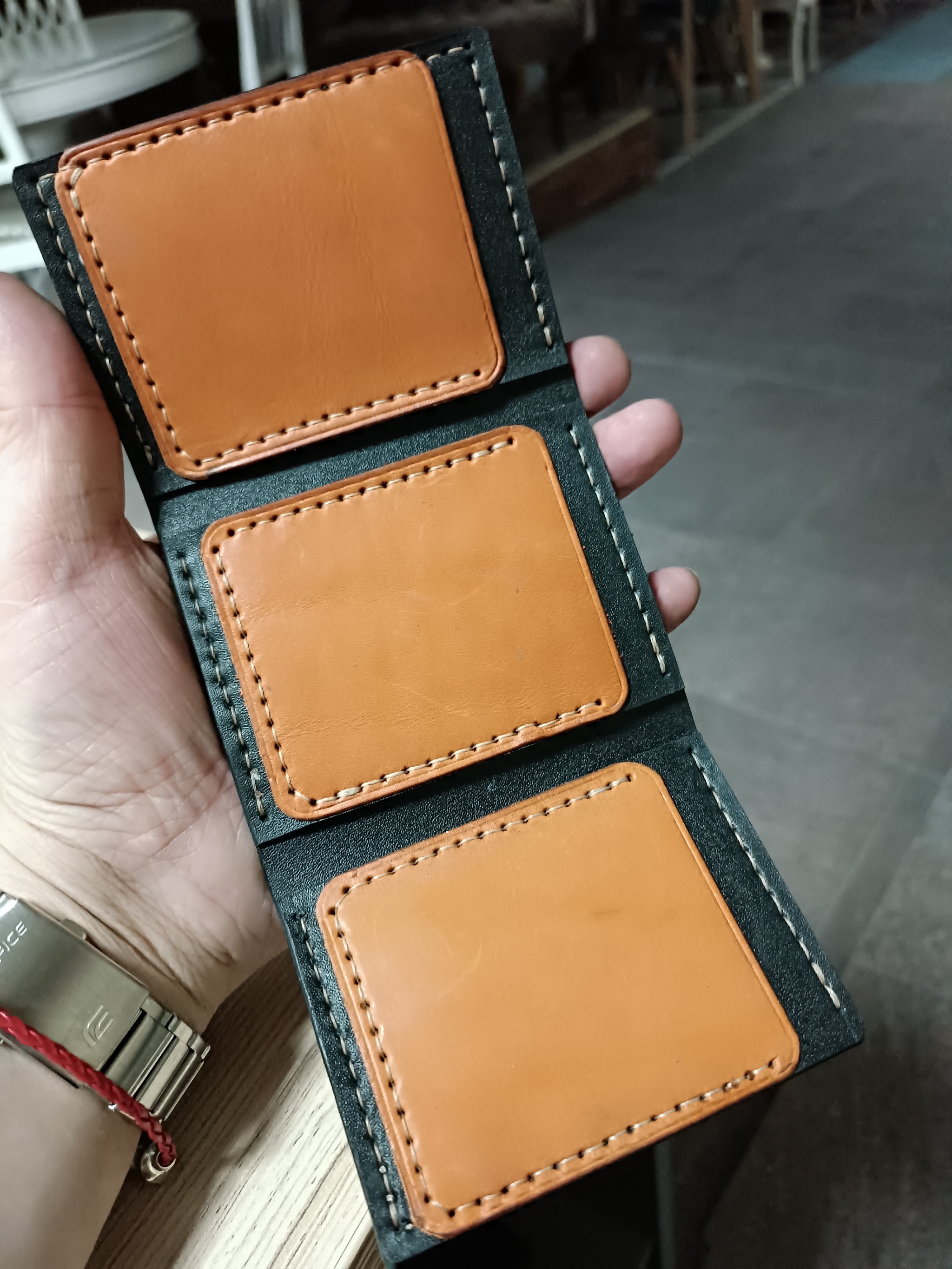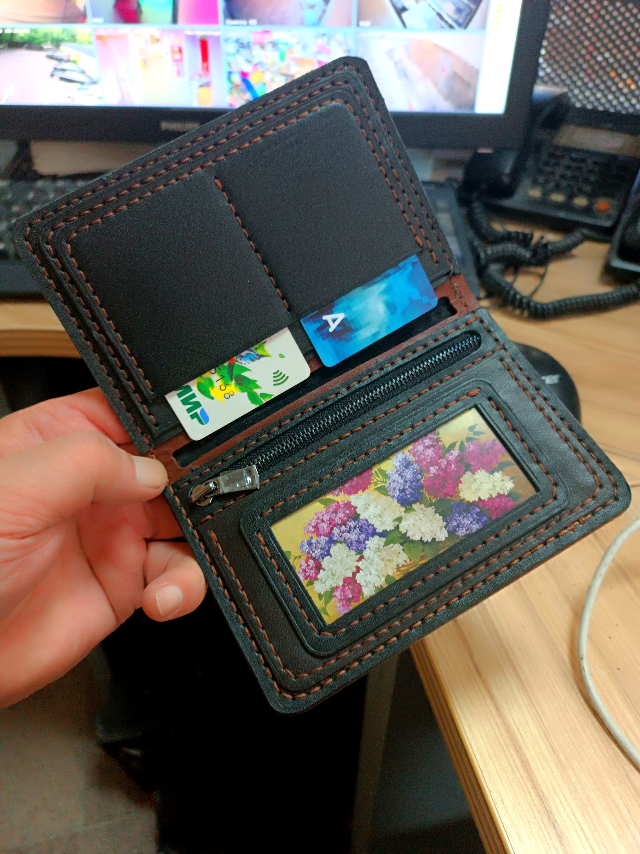 Три кармашка для пластиковых карт, и там есть два внутренних кармана, тоже можно положить несколько карт.