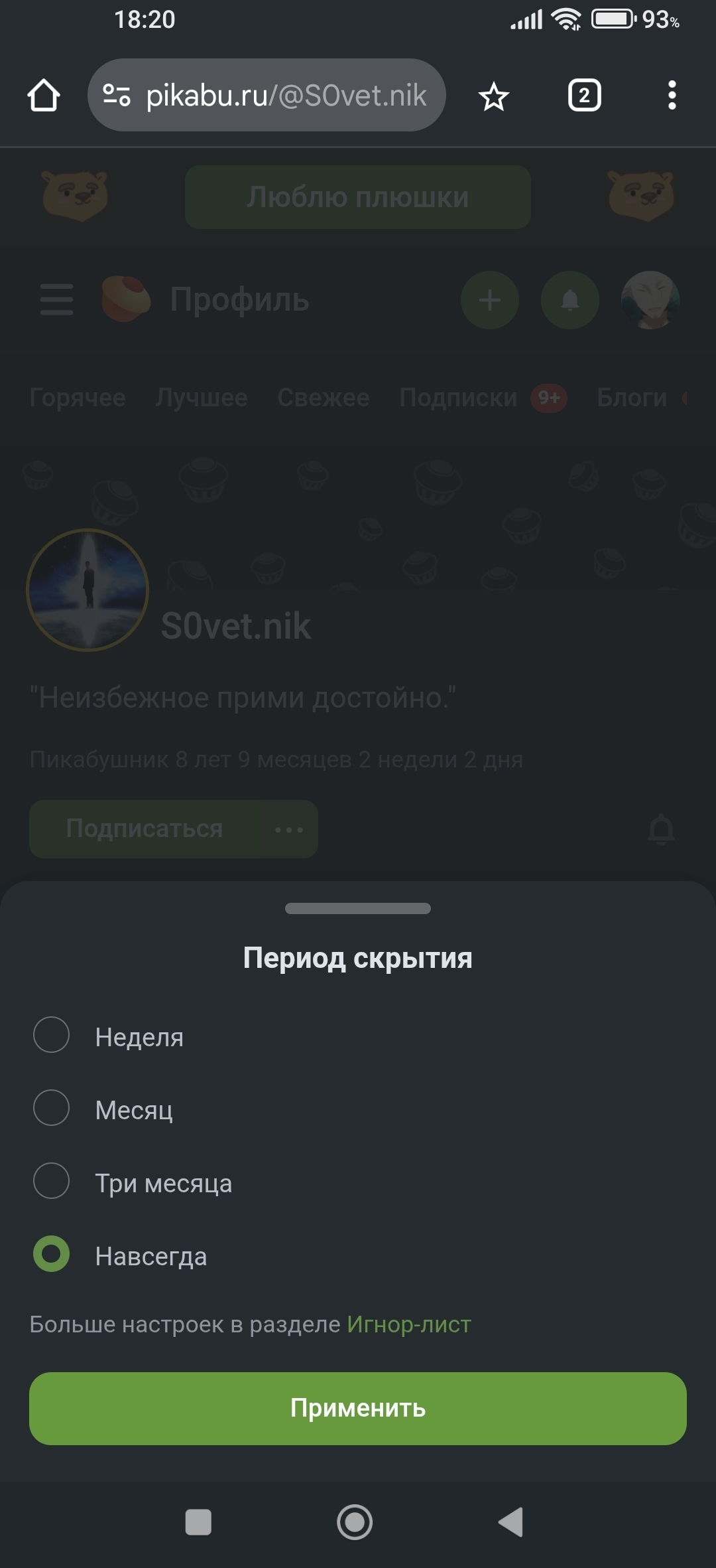 Т.е. тот факт, что ты ... лично ты ... один ты ... больше не будешь смотреть его посты, заблокировав их для себя самого, в твоем понимании, настолько "дорогого стоит", что все восемь лет на Пикабу для ТС "пошли прахом"?