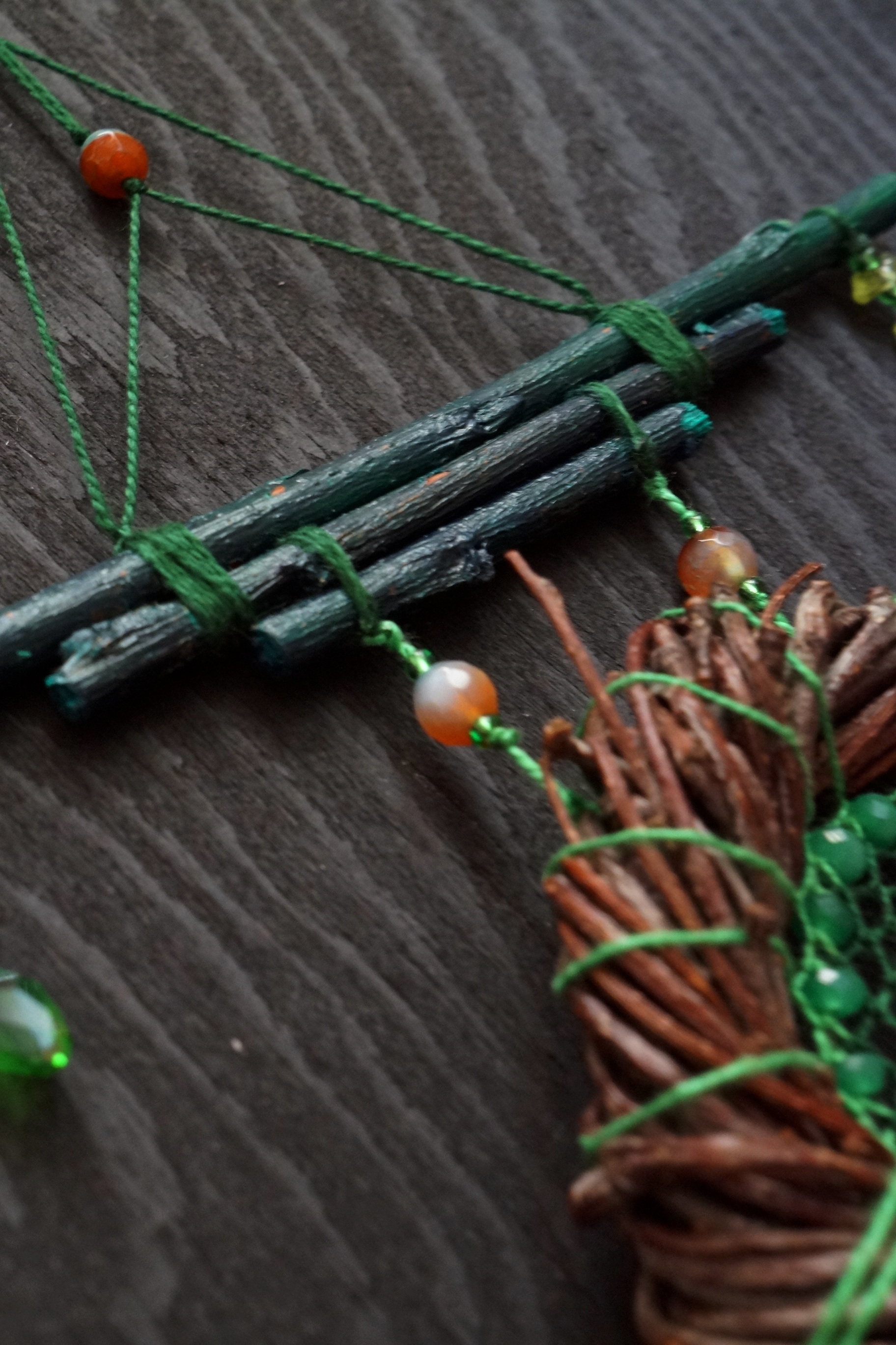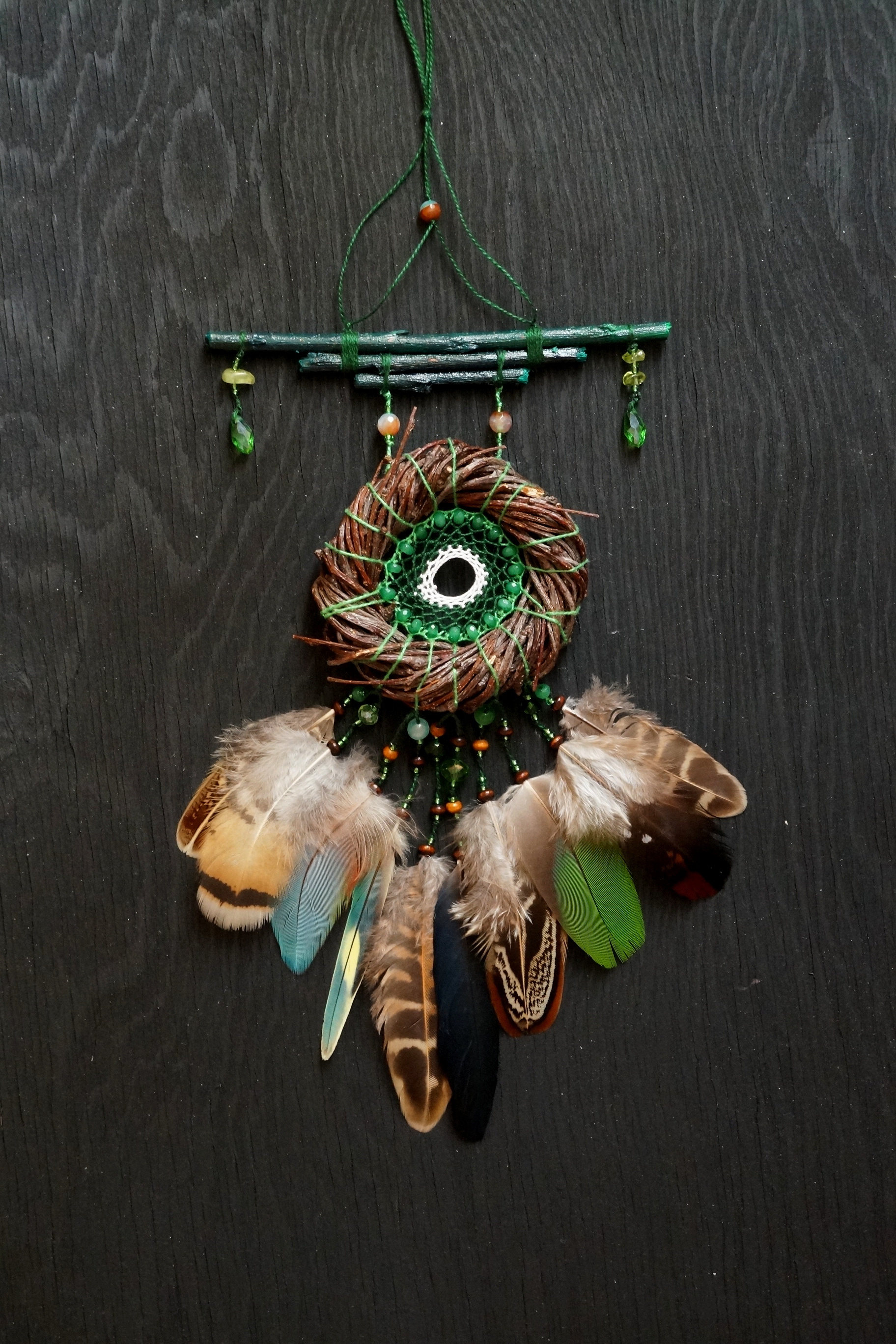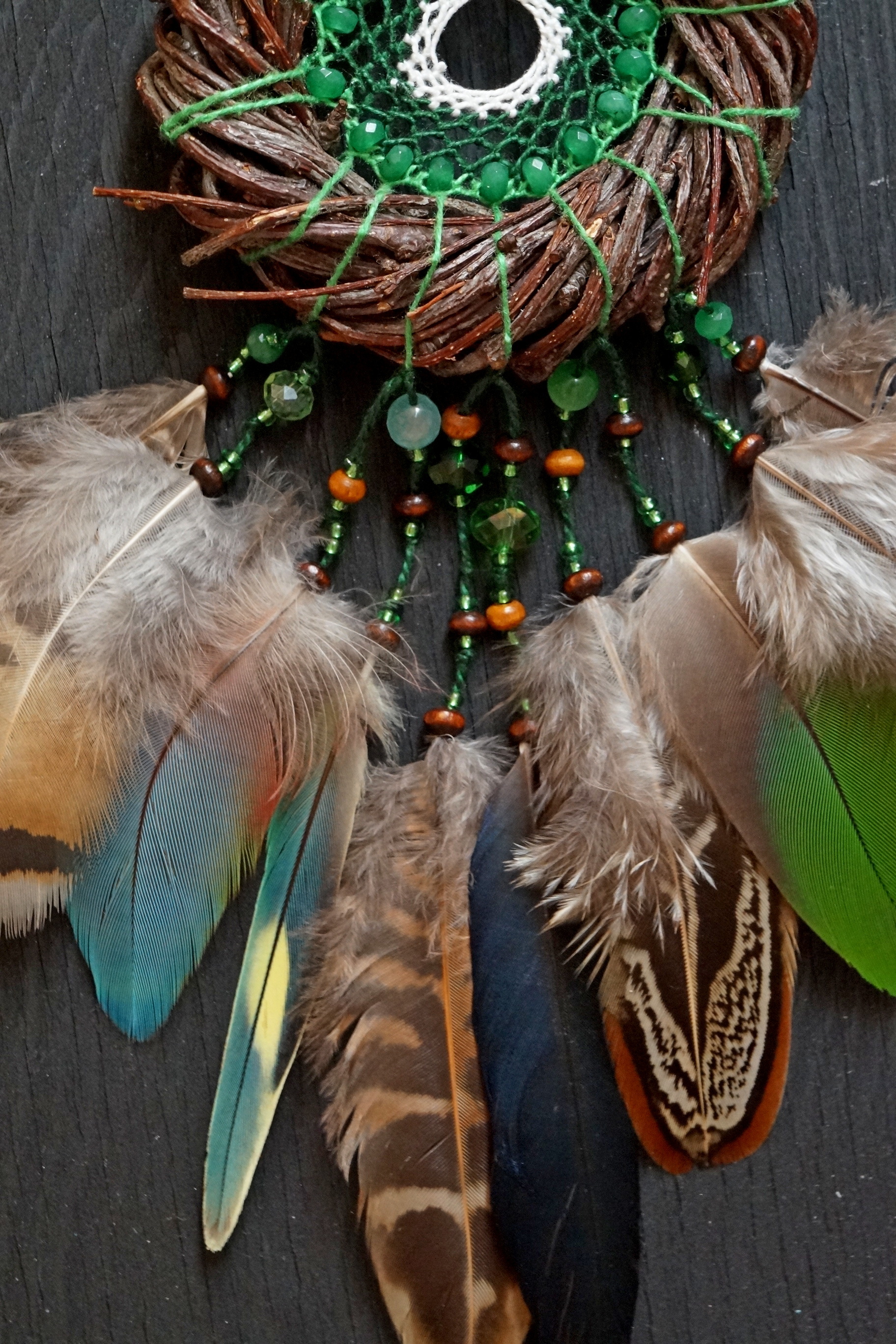 Перья фазанов, попугаев (ара, волнистый, сенегальский) и сороки. Бусины стеклянные, деревянные, из натурального камня.