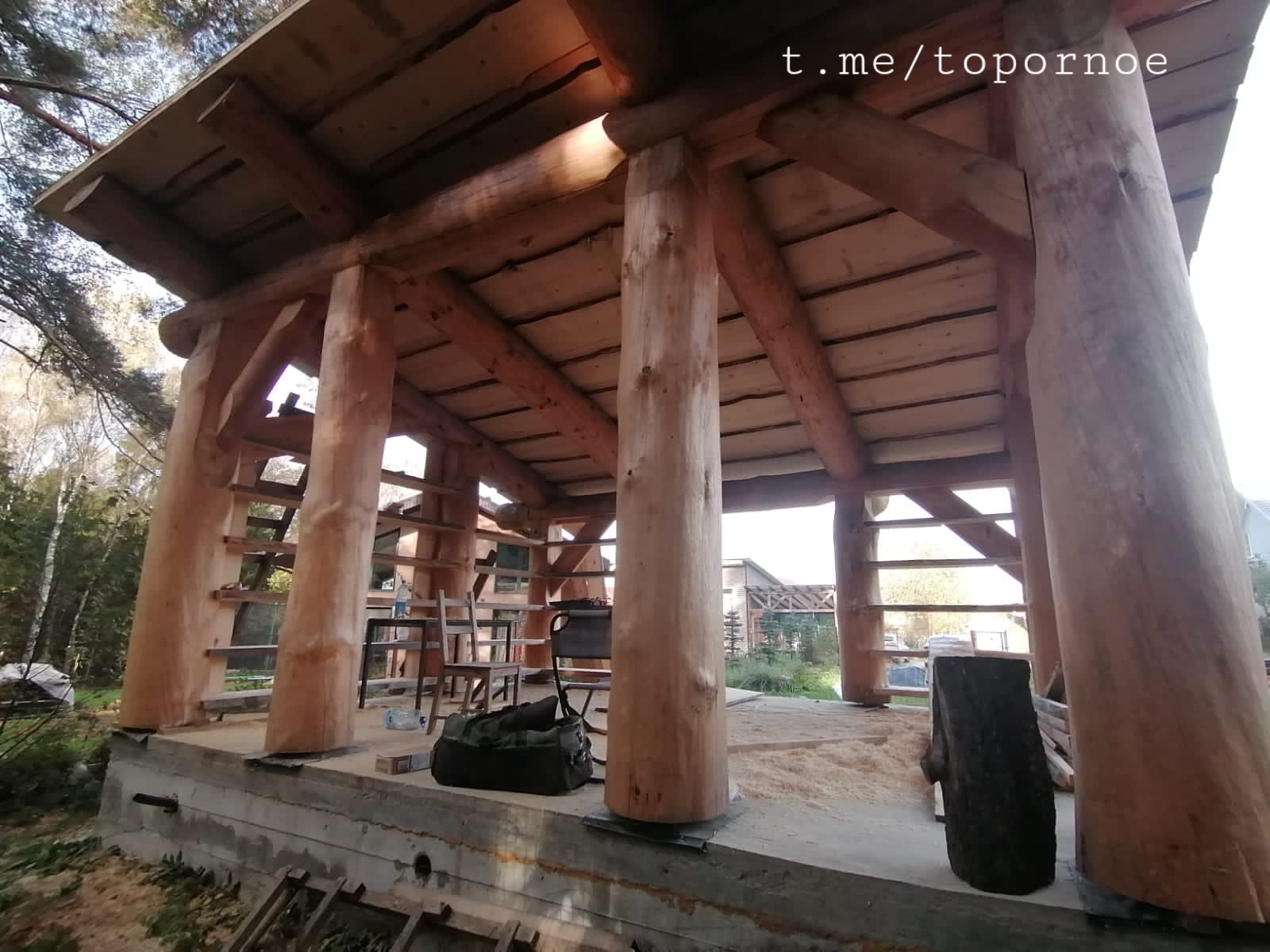 Эта небольшая история получила продолжение: летняя кухня обрасла полками и кровлей. Напомню: "летней кухней" она стала в процессе внезапно 🙂, изначально планировали просто сарайчик, поэтому и бревна не такие толстыя🙂. Друзья планируйте планы заранее, пытайтесь во всяком случае