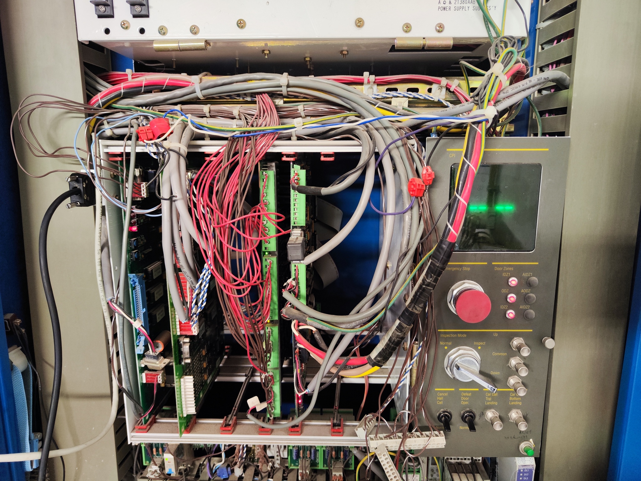 Набор электронных плат управления и панель инспекции. Слева вверху видно хвостик от сервисного прибора(service tool). Очень полезный и невероятно удобный прибор от Отис