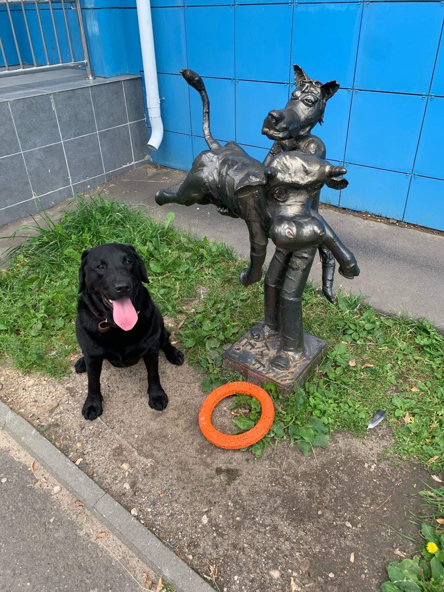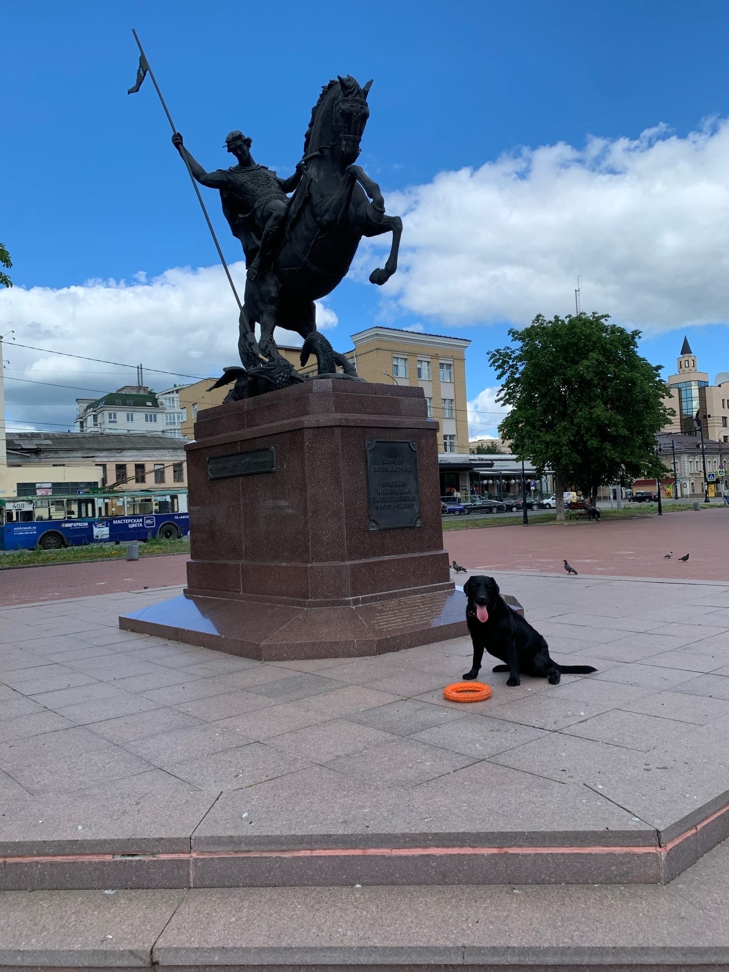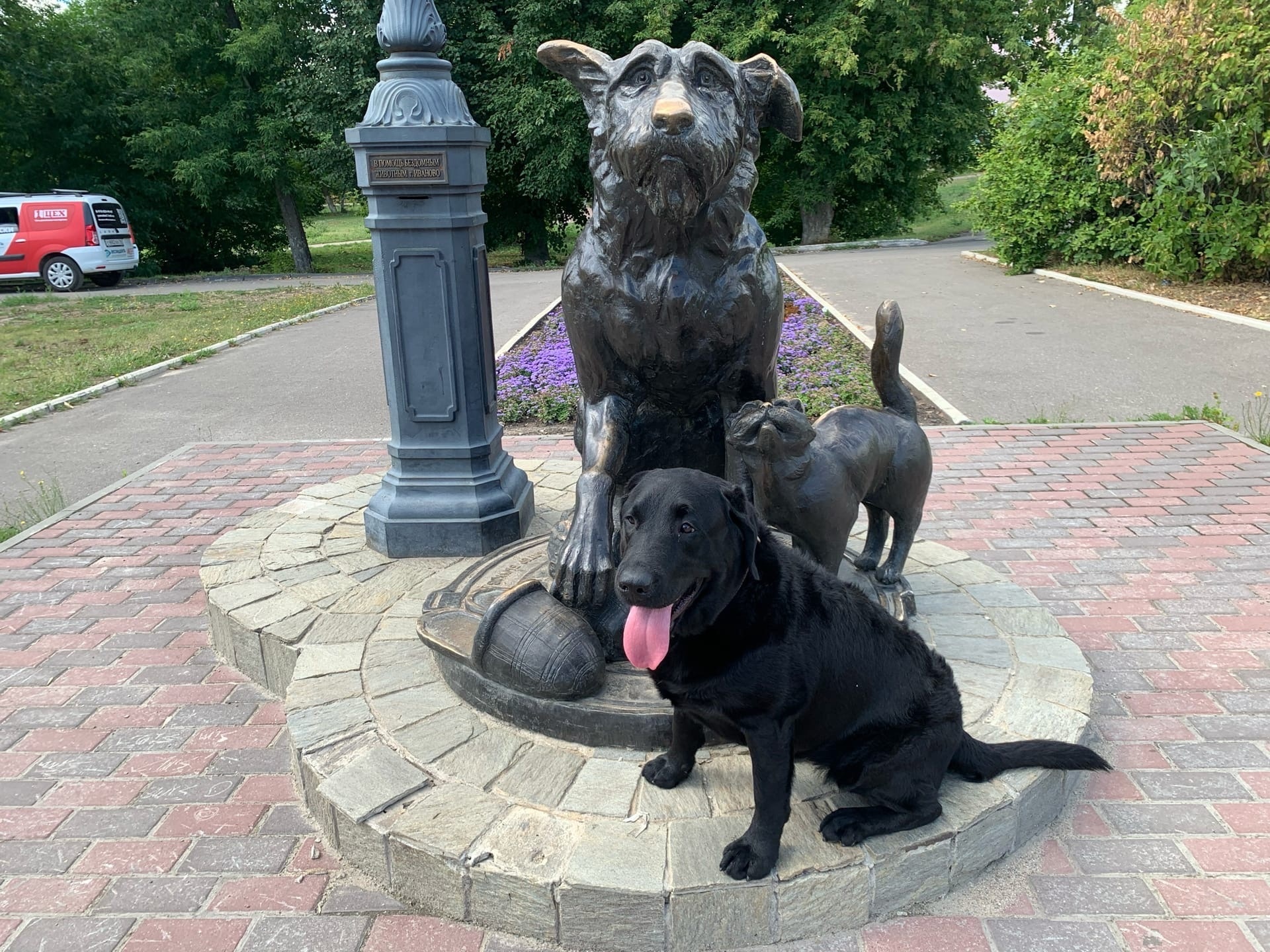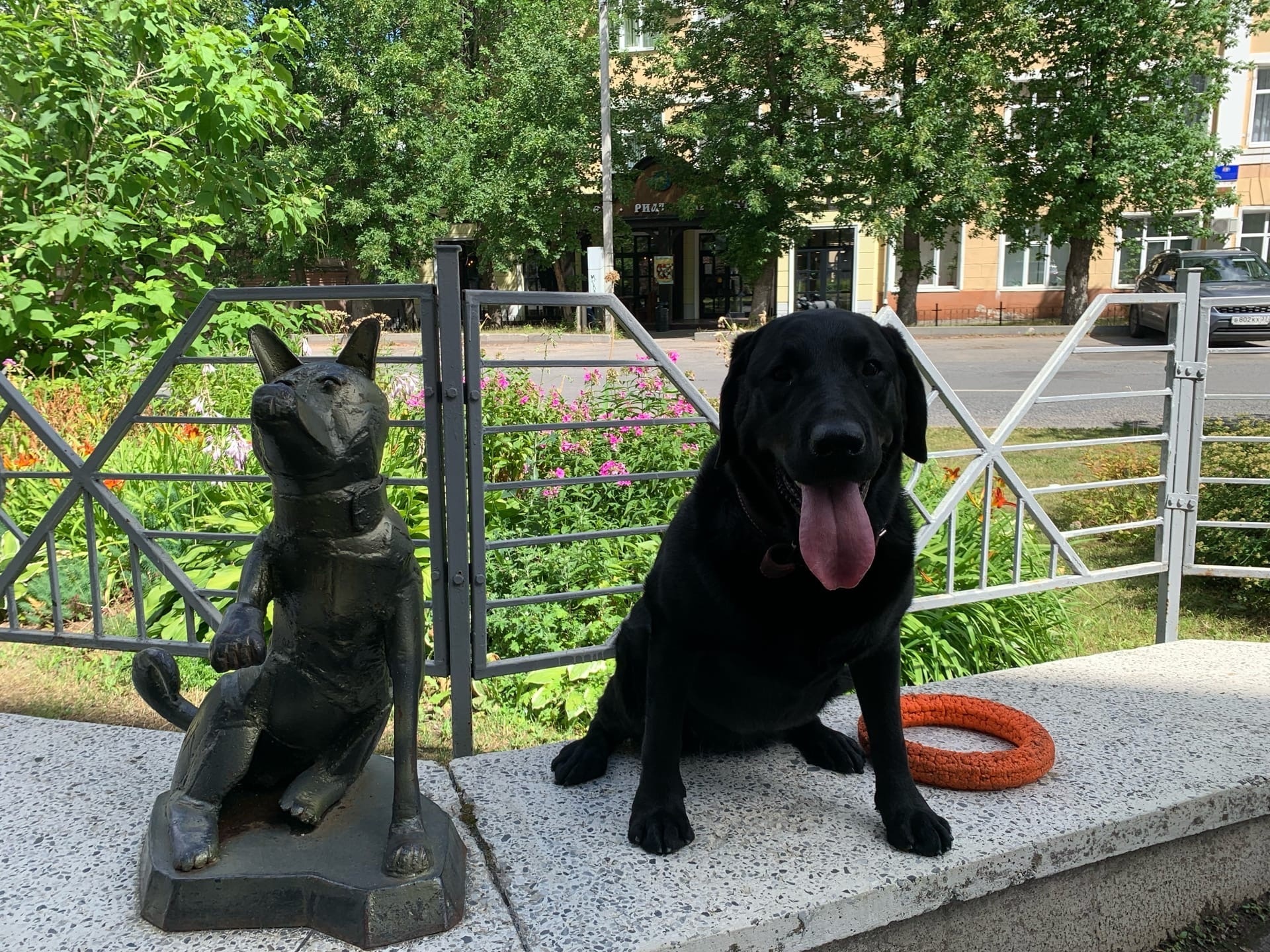 Белке довелось запечатлеться с небольшими уличными экспонатами и на главных площадях города. Надо сказать, что в данной поездке Белка научилась позировать и изучила несколько новых команд, связанных с этим действом.