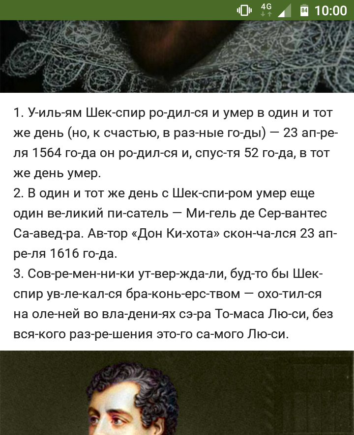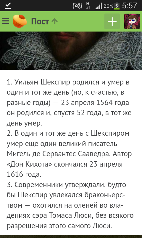 1. Уильям Шекспир родился и умер в один и тот же день (но, к счастью, в разные годы) — 23 апреля 1564 года он родился и, спустя 52 года, в тот же день умер.