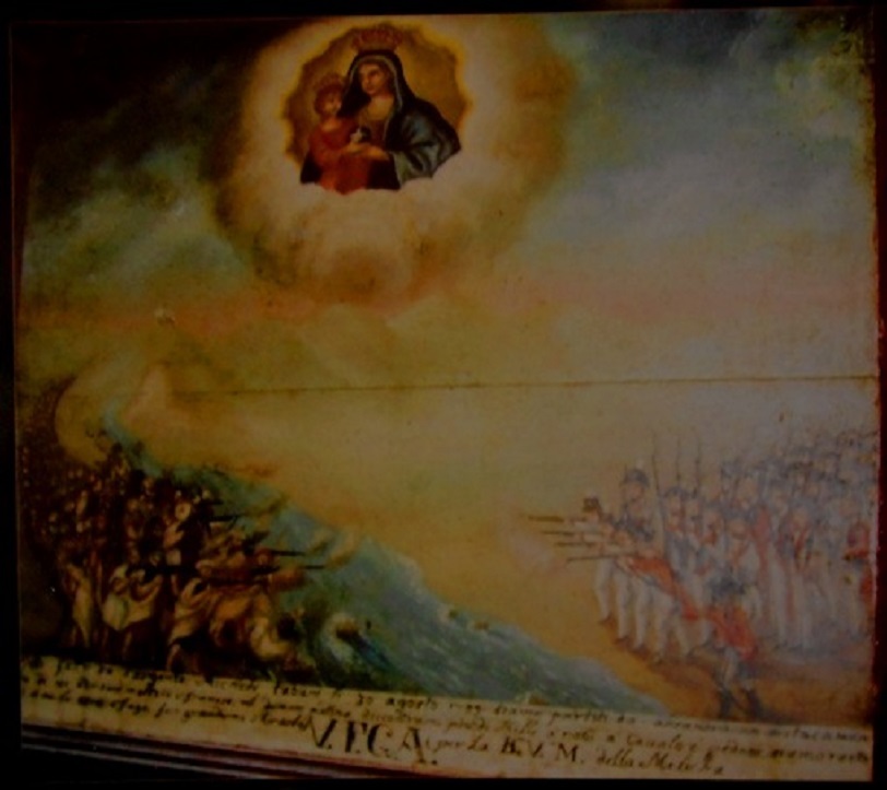 Подпись под картиной гласит: "30 августа 1799 нас было сто мальтийских и французских солдат, шедших из Рамании к Александрийскому каналу, когда мы были атакованы огромным числом арабов и спасены вмешательством Благословенной Девы Марии из Меллихи. Мы воззвали к Ней и победили, а неприятель бежал". Изображение Божьей Матери выполнено очень профессионально. Батальная же сцена принадлежит кисти неплохого рисовальщика, но работавшего в наивной манере и явно не имевшего представления об искусстве живописи. Тем не менее, фигурки бойцов прорисованы до мельчайших деталей, их оружие, одежда и позы запечатлены в величайших подробностях (даже заплаты на выгоревших мундирах и ободранные на коленях брюки), что свидетельствует о близком знакомстве автора картины с военным делом. Считается, что, вернувшись на Мальту, ветеран Мальтийского легиона сержант Мишель Табуни в память о незабываемой победе написал "Ex Voto", и только образ Божьей Матери не решился рисовать сам и пригласил профессионала.