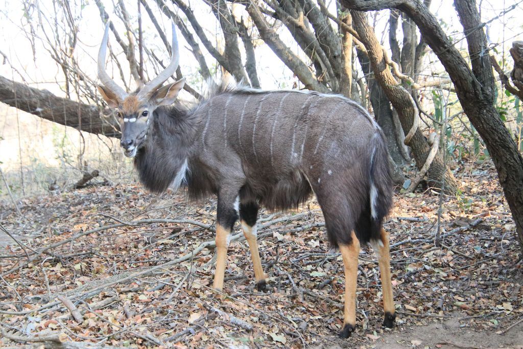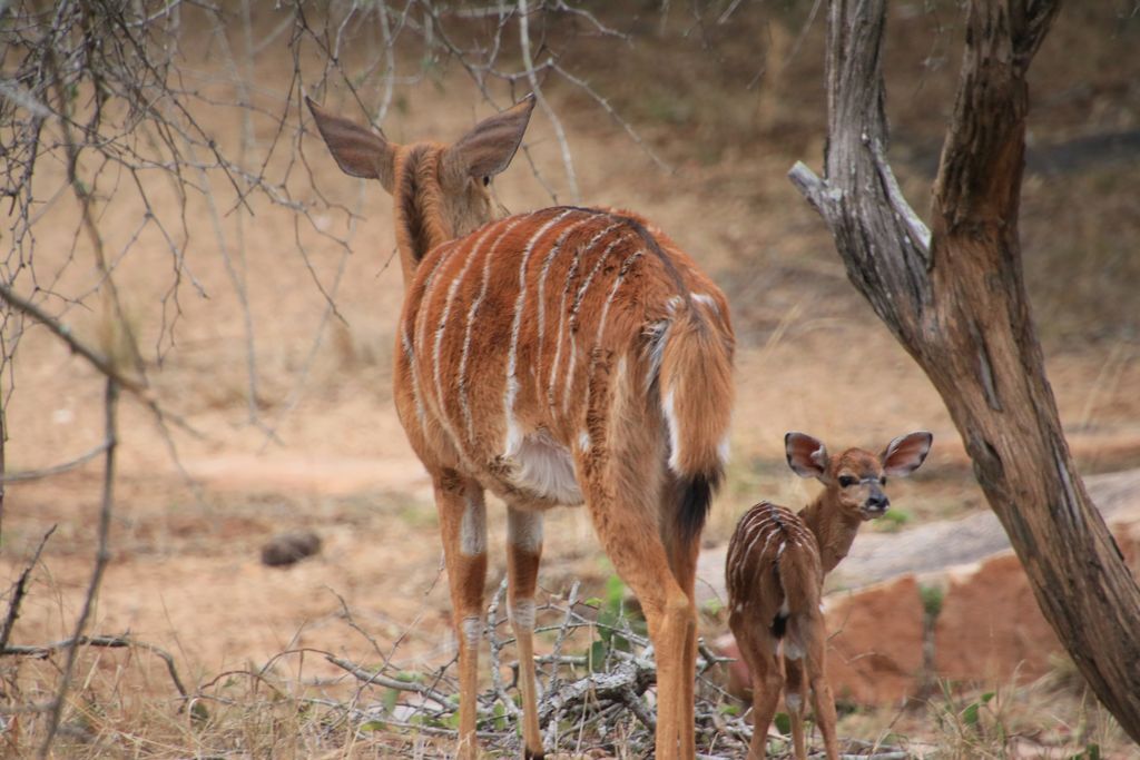 Гуляя в окрестностях на нашего кемпа, мы наткнулись на антилопу Ньяла, которая мирно гуляла со своим новорожденным дитя. Со слов рейнджера, его было всего один день от роду, а он уже на ногах и вполне самостоятельный.