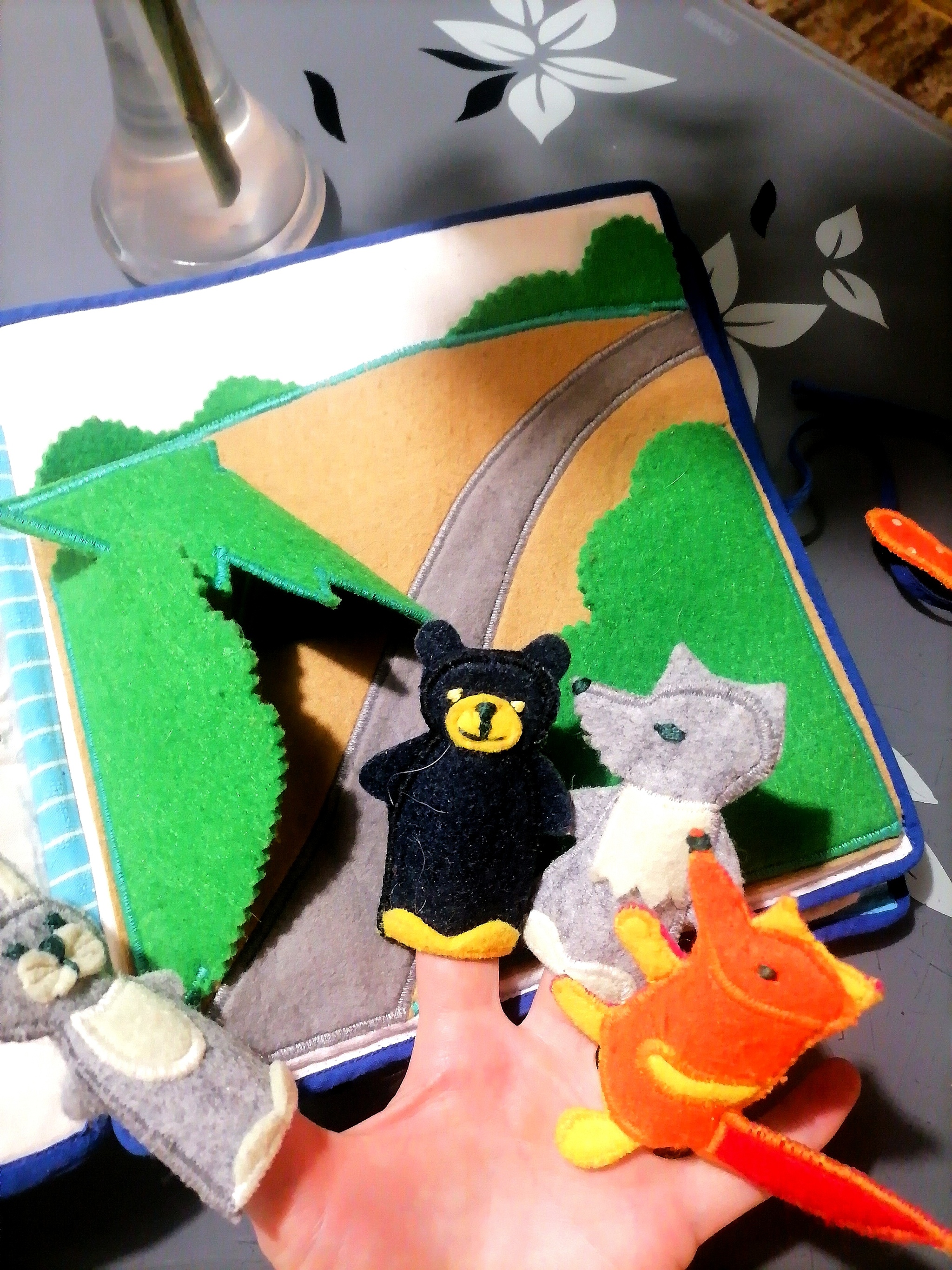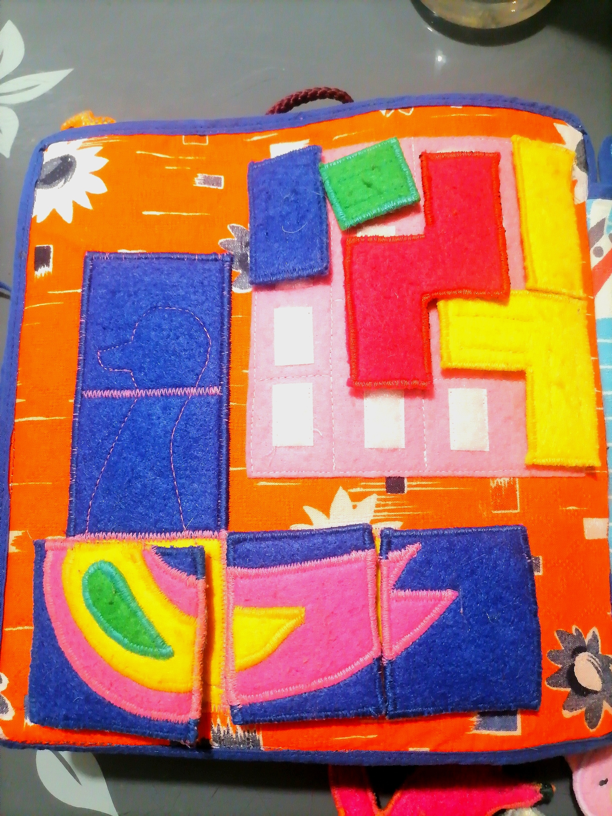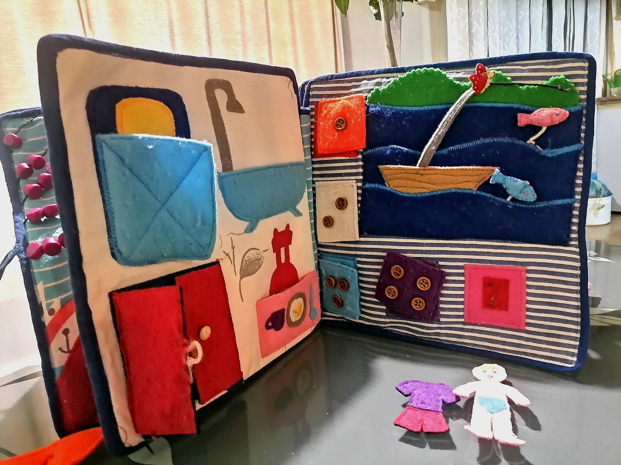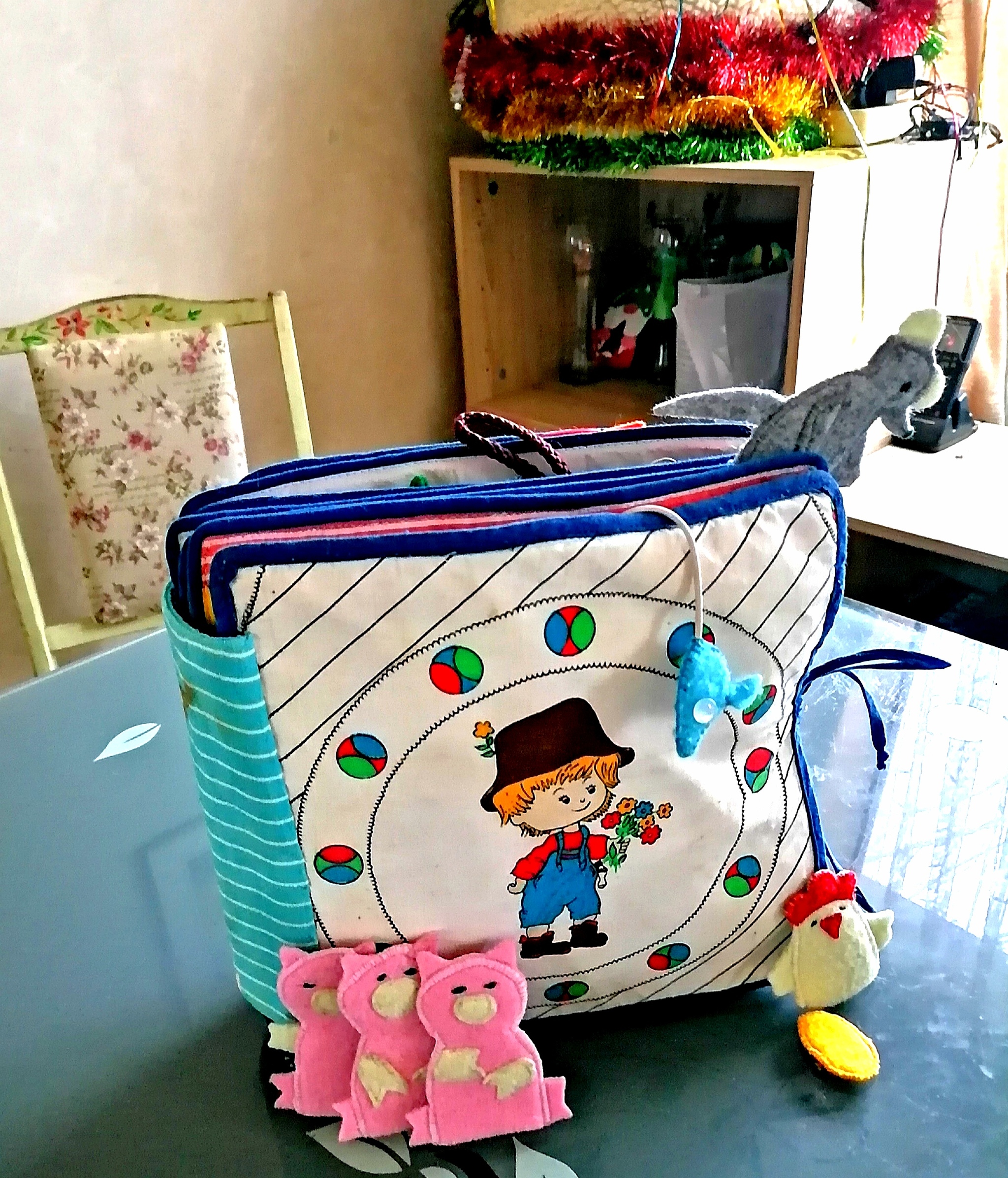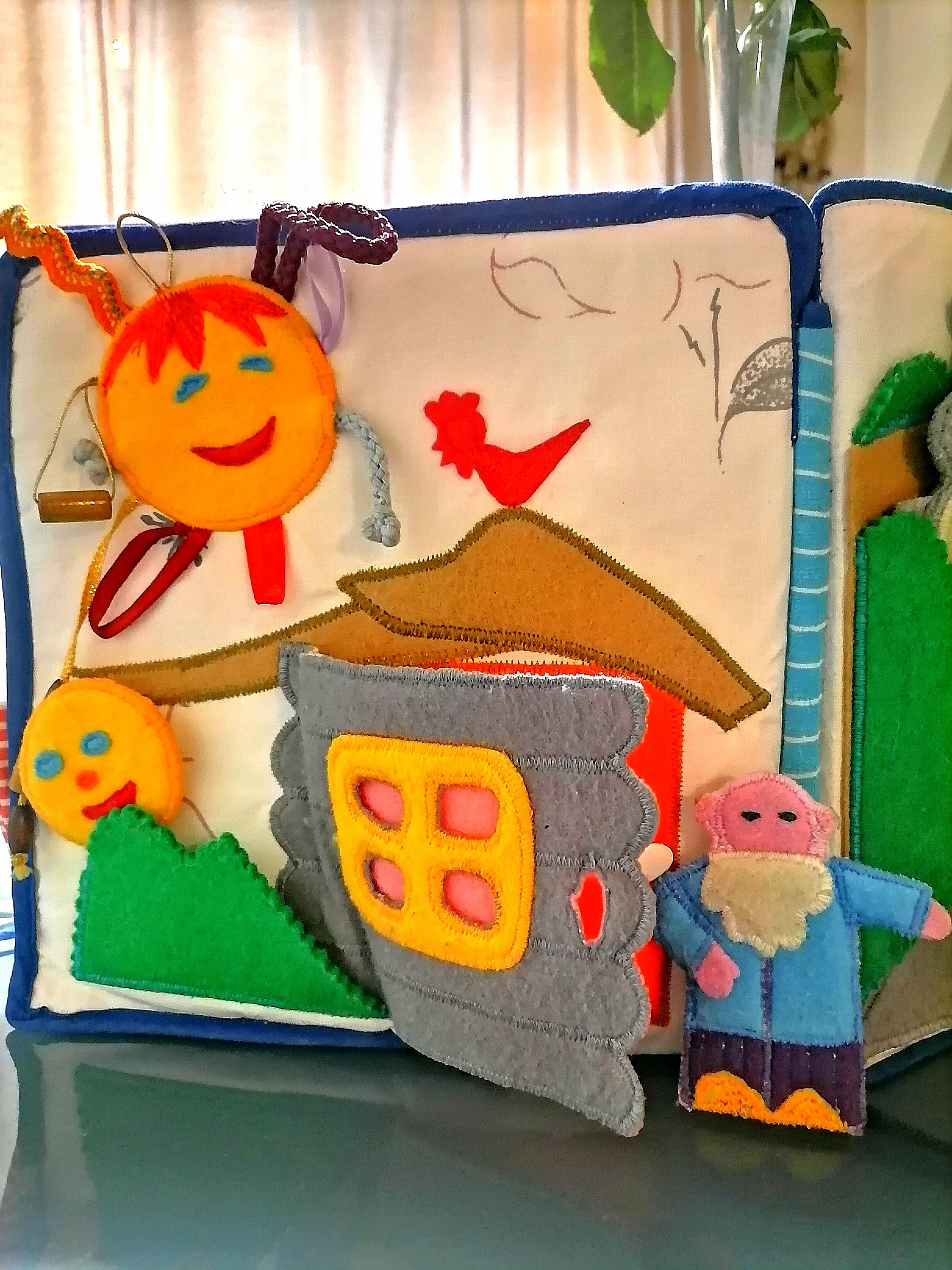 Когда первому малому исполнился год, мама заморочилась и подарила книжку - развивашку хэндмэйд. Это было очень неожиданно, эта супертрудоёмкая работа оставась в тайне до момента дарения. Открыв, восхитившись точностью, тонкостью, продуманностью, количеством деталей, вглядевшись в фон, увиидела, что использованы мои старые штаны, простынки, всякое короче. Офигеть сказала я и получилось сохранить до сегодня большую часть книги. И вот уже второй малой изучает книгу. А к слову, 8 лет прошло. Там и для моторики из глины, что дома можно запекать, детальки, и прилипучки - отлипучки, куча персонажей для сказок колобок, три поросёнка, курочка-ряба - все надеваются на пальцы получается уратеатр, фигурки на магнитиках, на пуговках, верёвочки, доставалочки, завязочки-тянучки. Очень кропотливый труд.