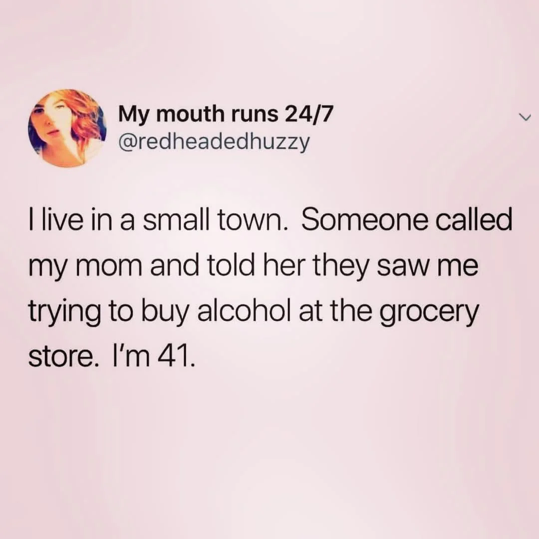 1995 Meraki1 6 месяцев назад Мамка заругает2 Живу в маленьком городе. Кто-то увидел, как я покупаю спиртное в продуктовом и позвонил пожаловаться моей маме. Мне 41. Взрослая жизнь Наш маленький городок Покупка Перевод Reddit Скриншот 62 5 5 Ещё 0