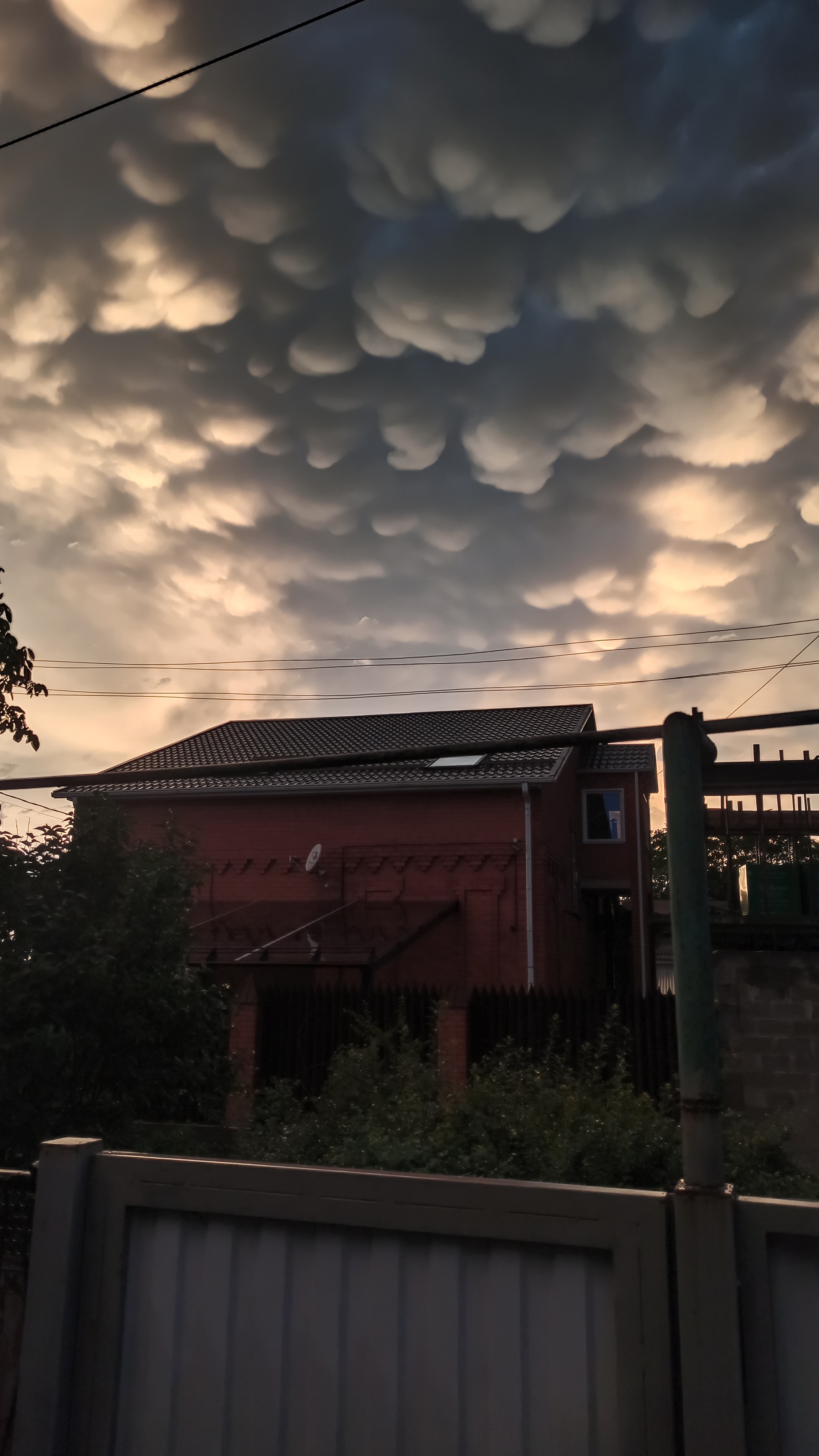 Мамматусы, они же вымеобразные облака. Гугл говорит, что эта редкая разновидность кучево-дождевых облаков образуется чаще всего в тропических широтах. Первый раз увидела вживую.