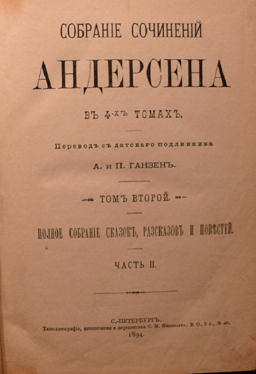 В 1894 году стараниями супругов Ганзенов вышло первое собрание сочинений Андерсена в четырех томах, куда вошли не только сказки, но и роман «Импровизатор», автобиография «Сказка моей жизни», пьесы, стихотворения, путевые очерки, письма и воспоминания современников.