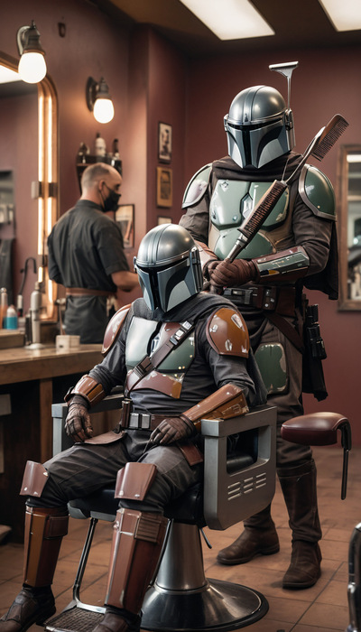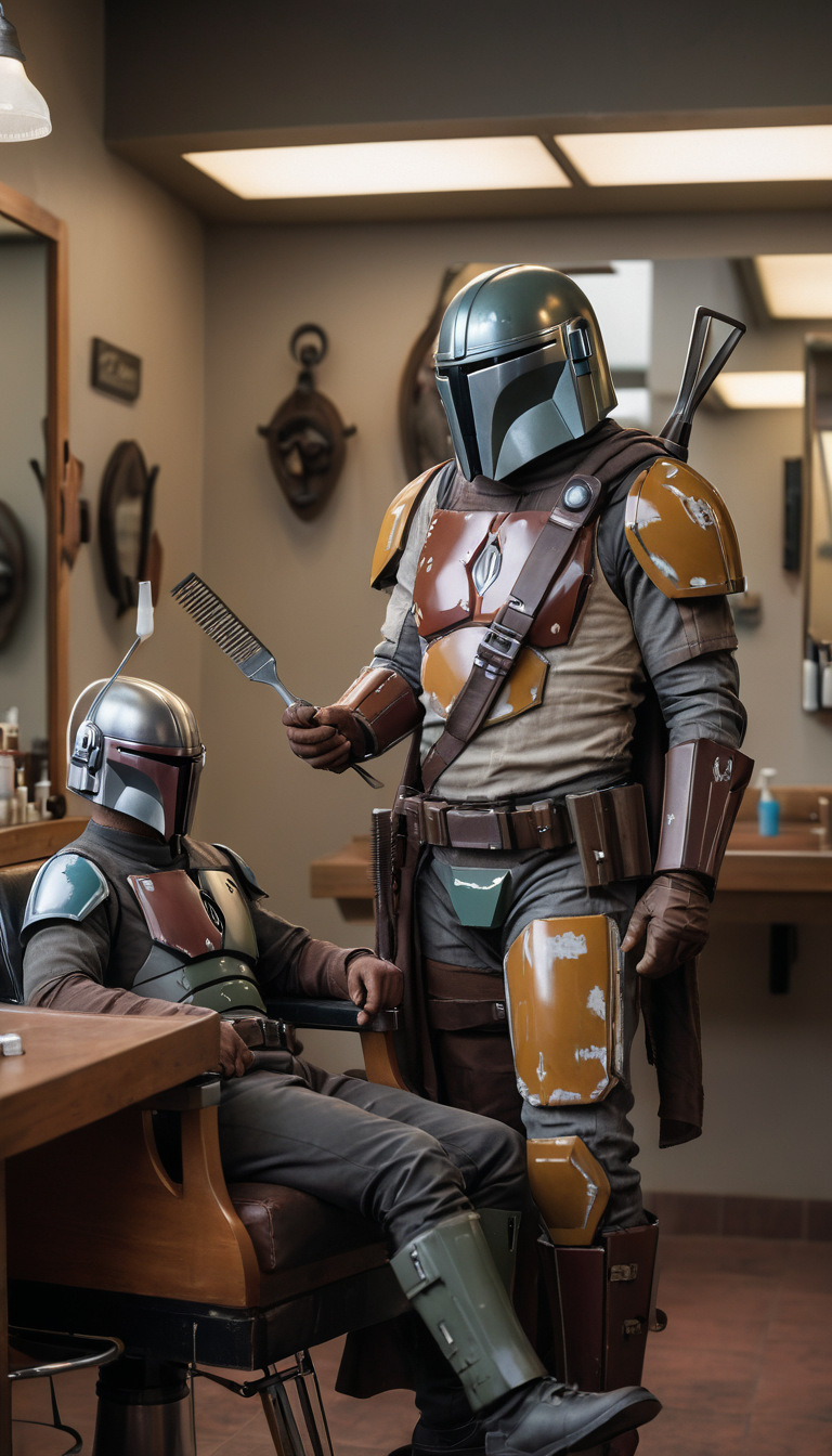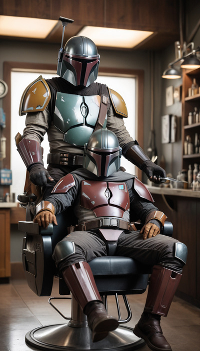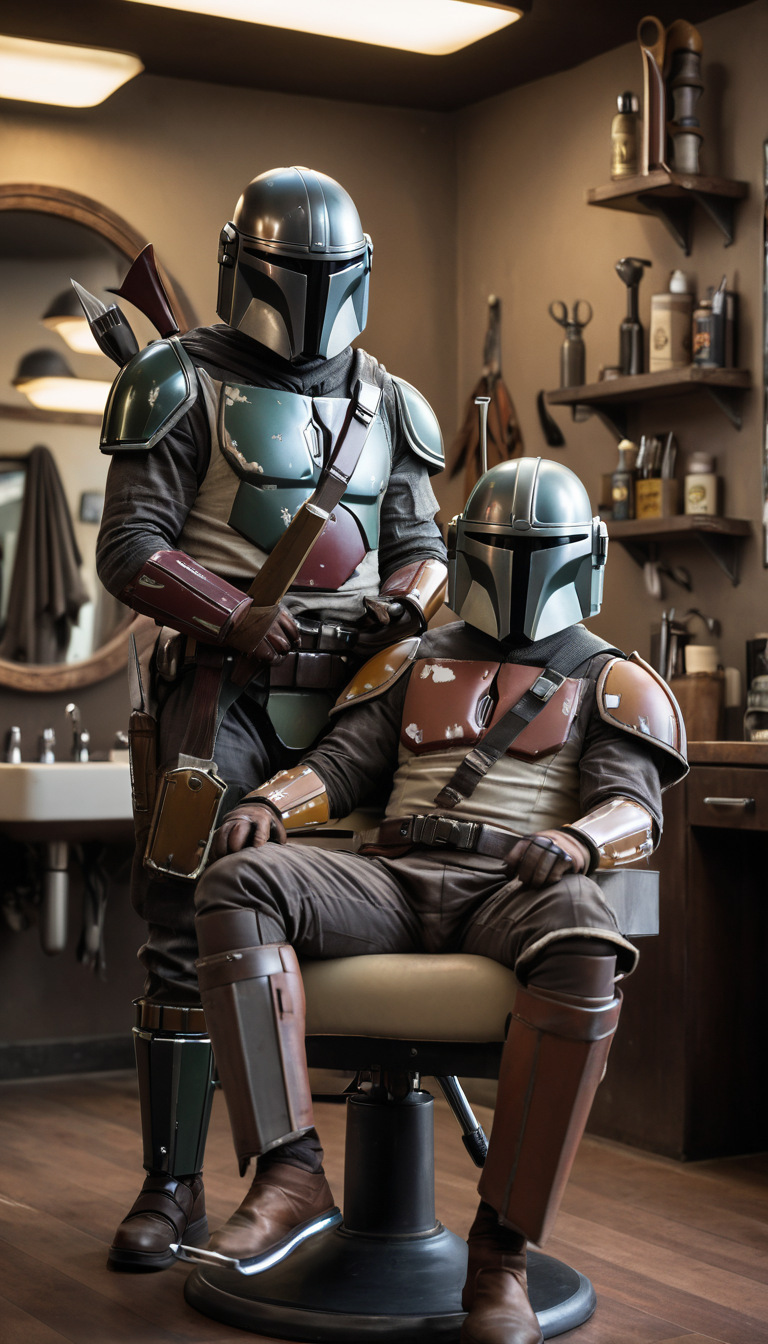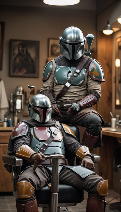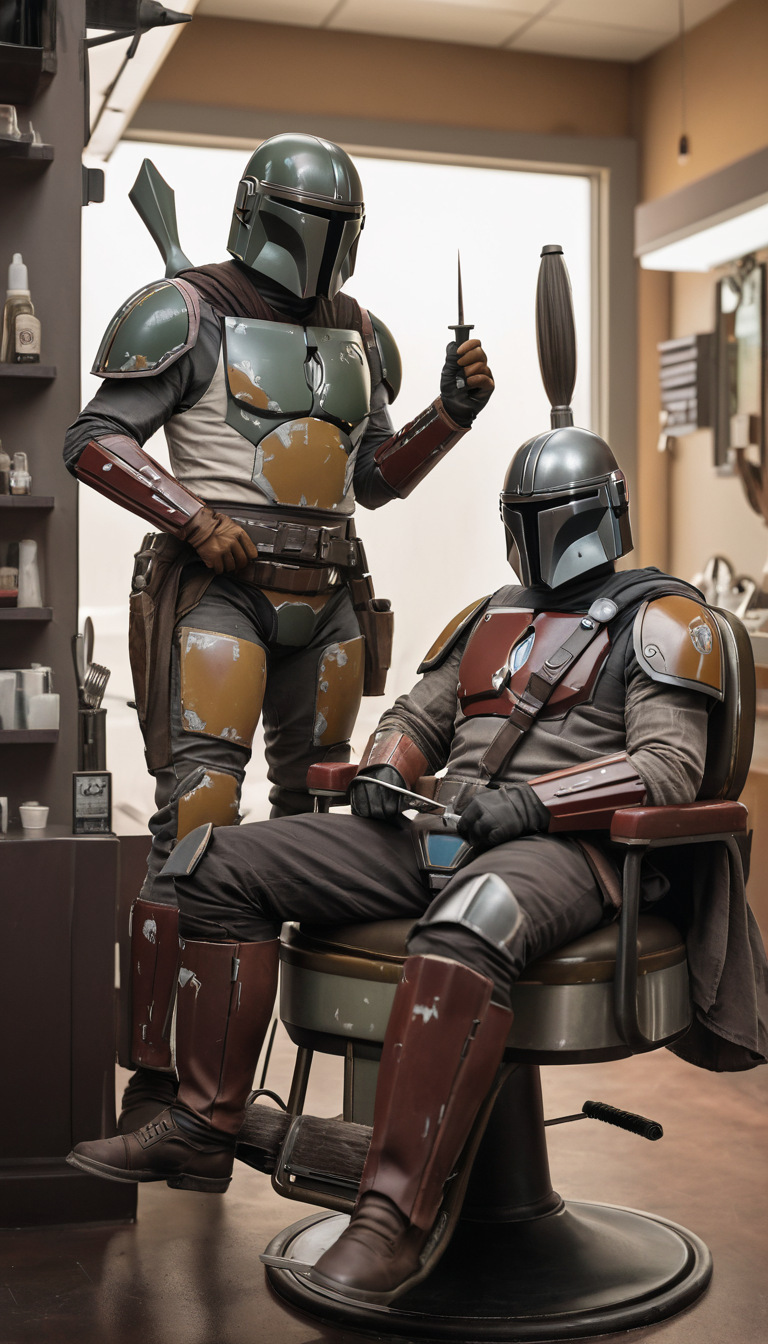 Промпт: Мандалорец в шлеме, сидит в кресле парикмахерской. Рядом стоит мандалорец-парикмахер в шлеме, парикмахерском фартуке поверх брони, держит в руках парикмахерские ножницы и расчёску.