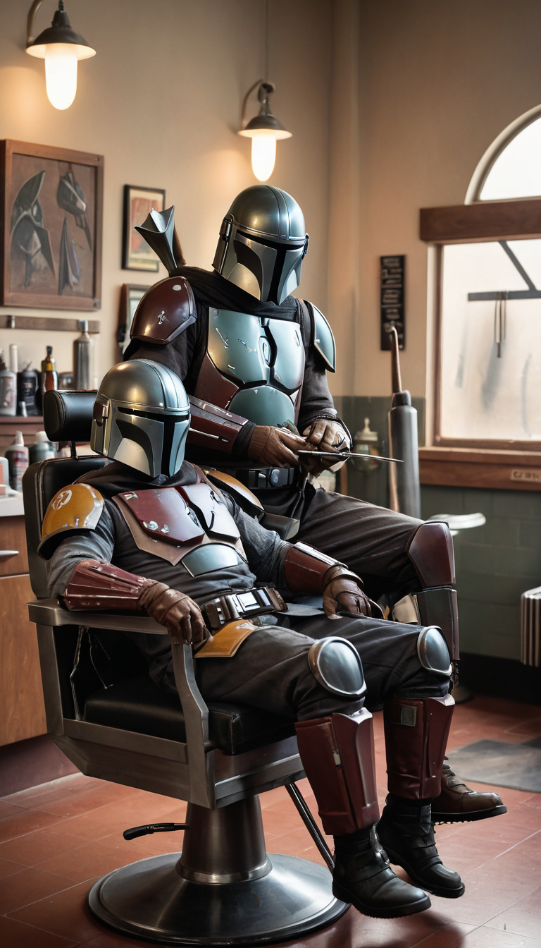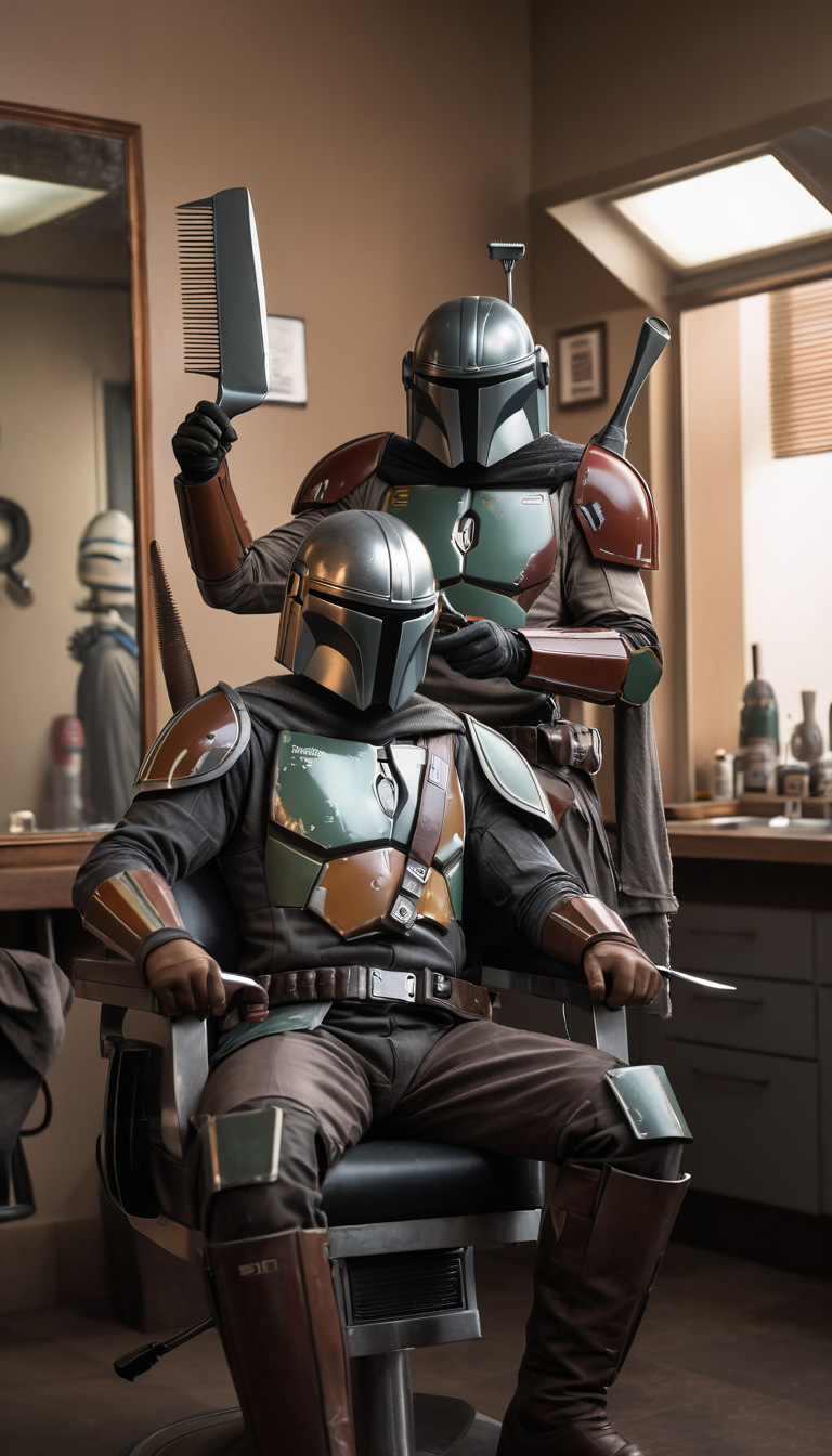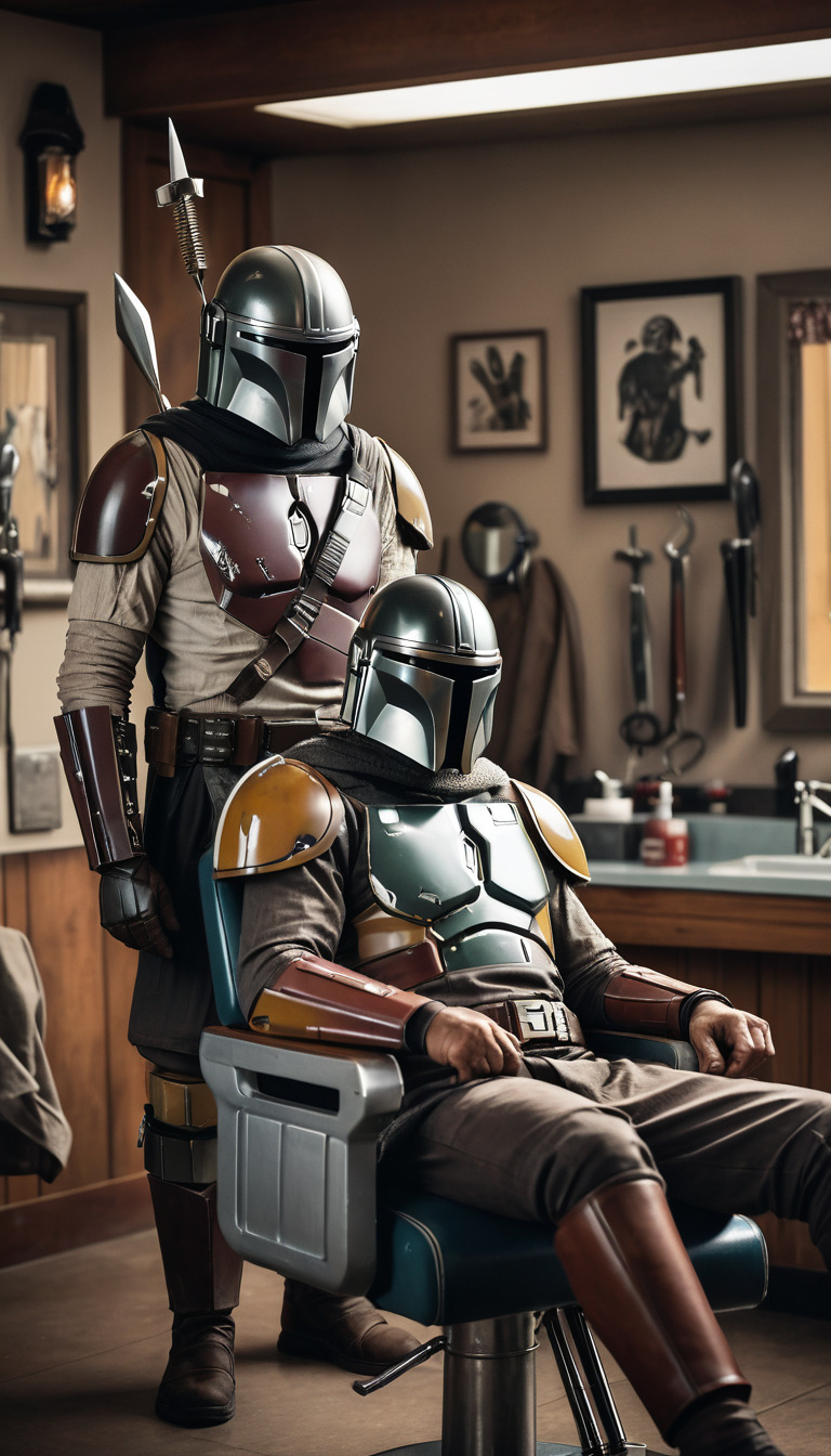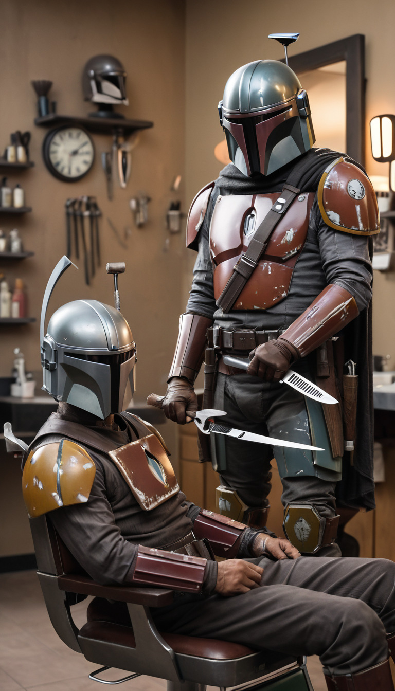Промпт: Мандалорец в шлеме, сидит в кресле парикмахерской. Рядом стоит мандалорец-парикмахер в шлеме, парикмахерском фартуке поверх брони, держит в руках парикмахерские ножницы и расчёску.