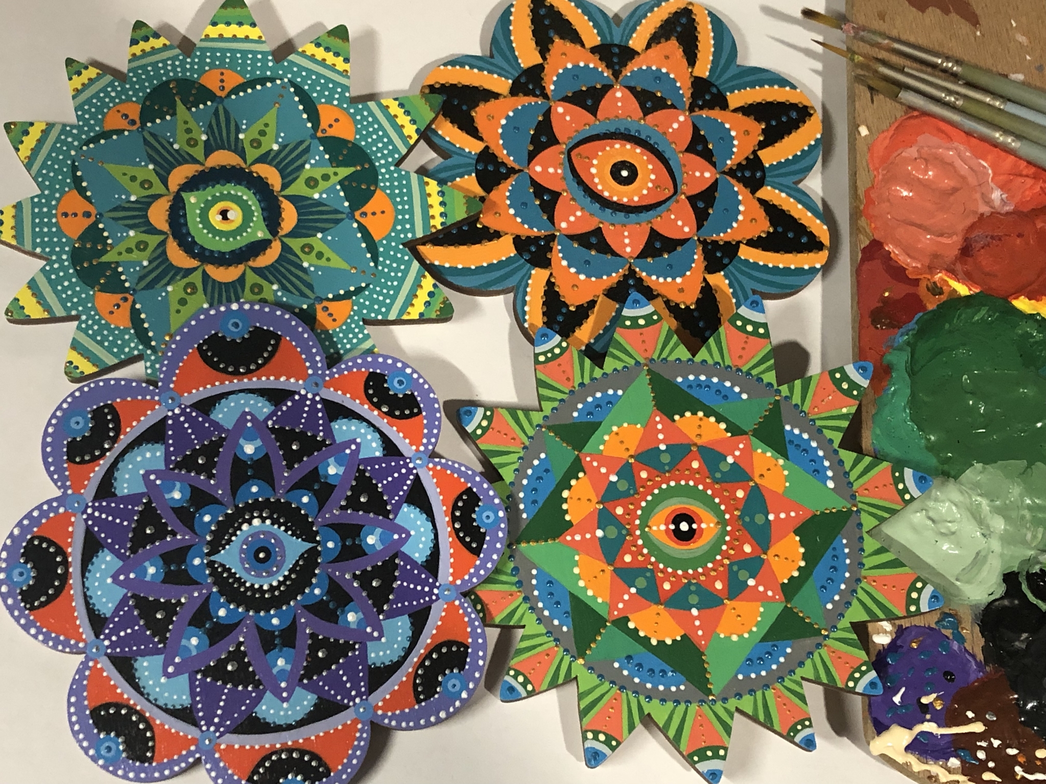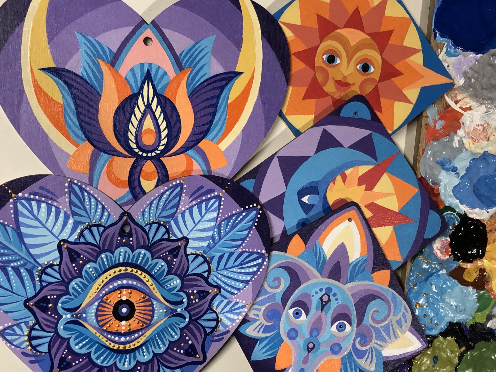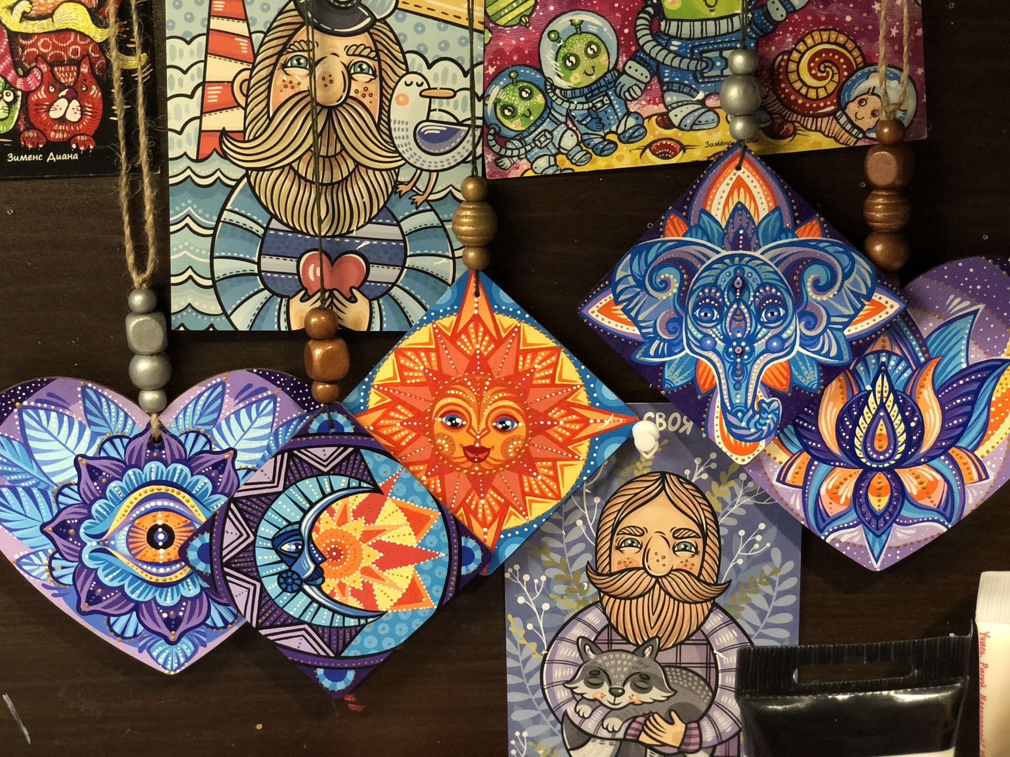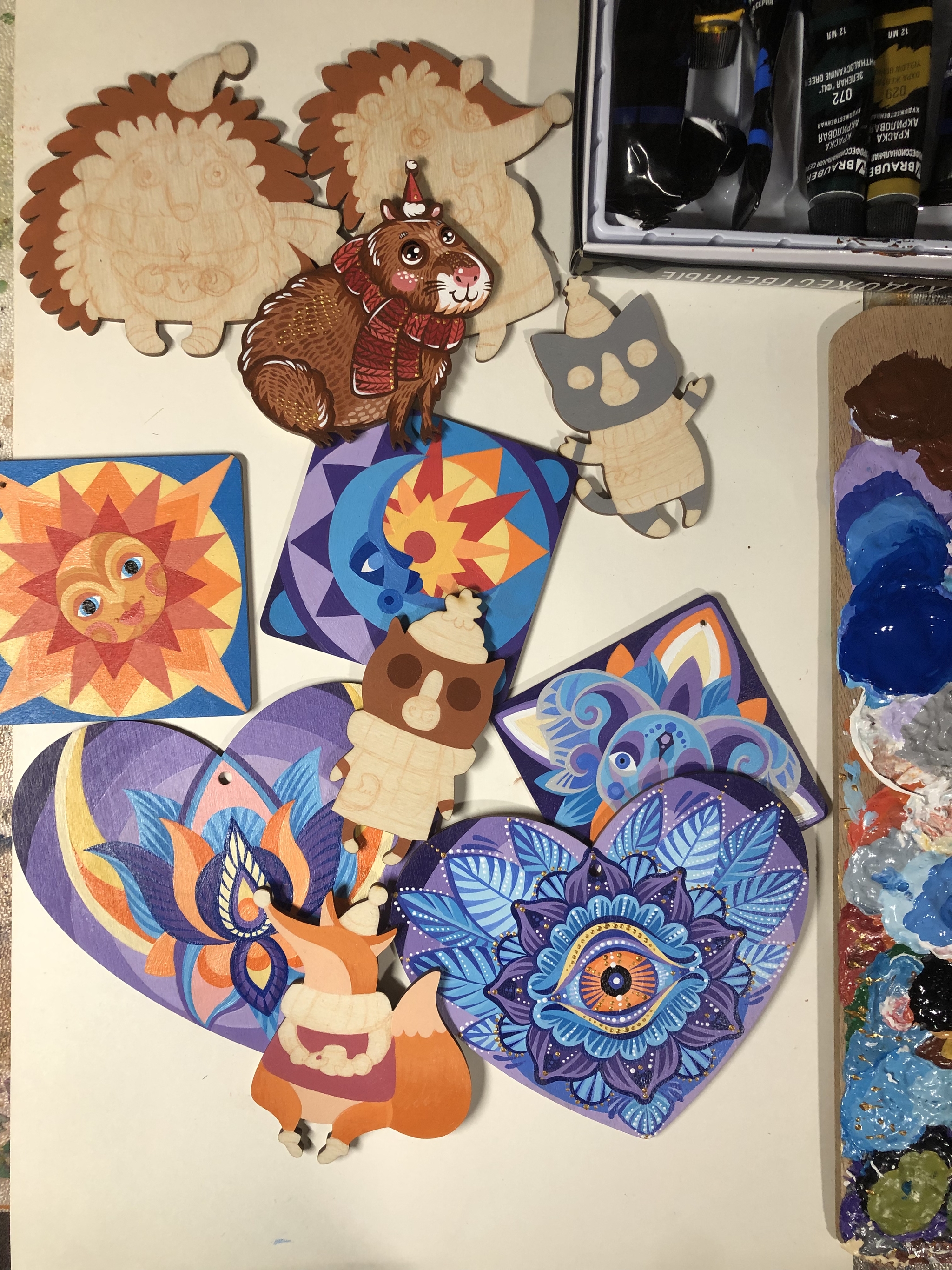 Расписаны акрилом, украшены акриловыми контурами, покрыты лаком.