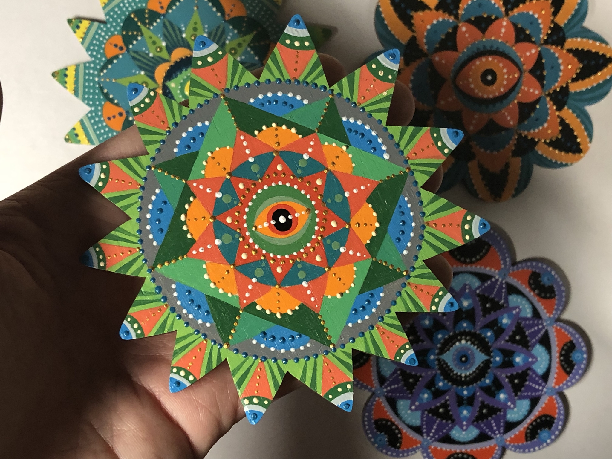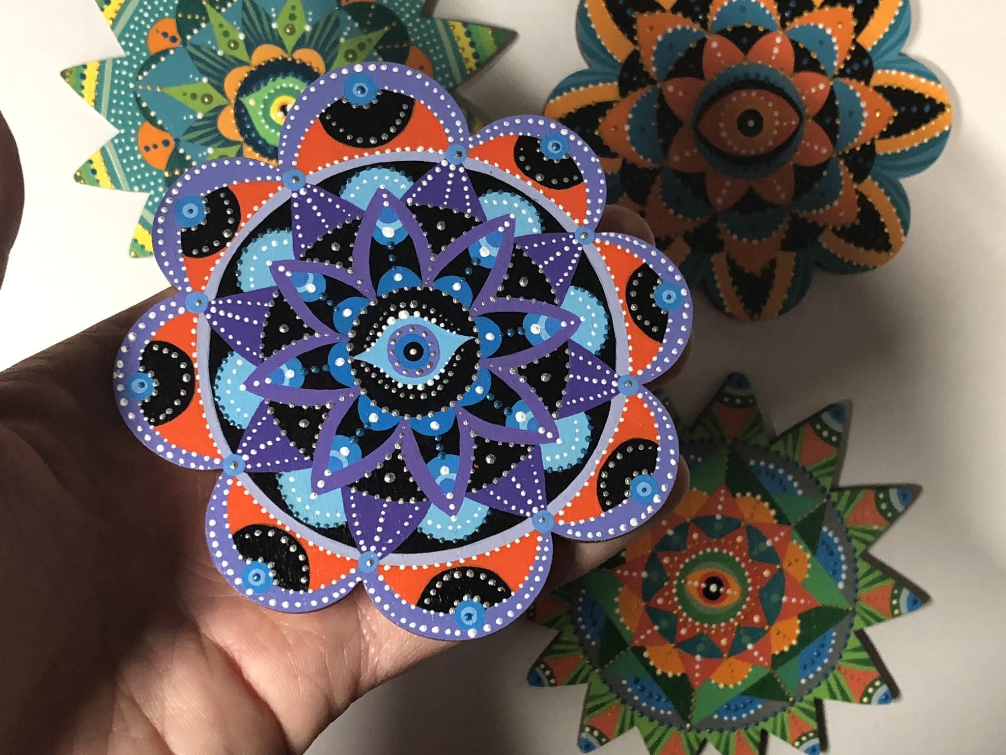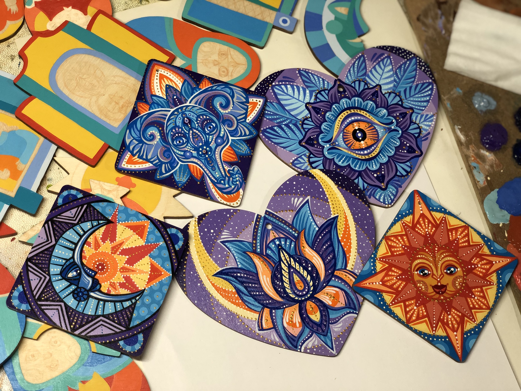 Расписаны акрилом, украшены акриловыми контурами, покрыты лаком.