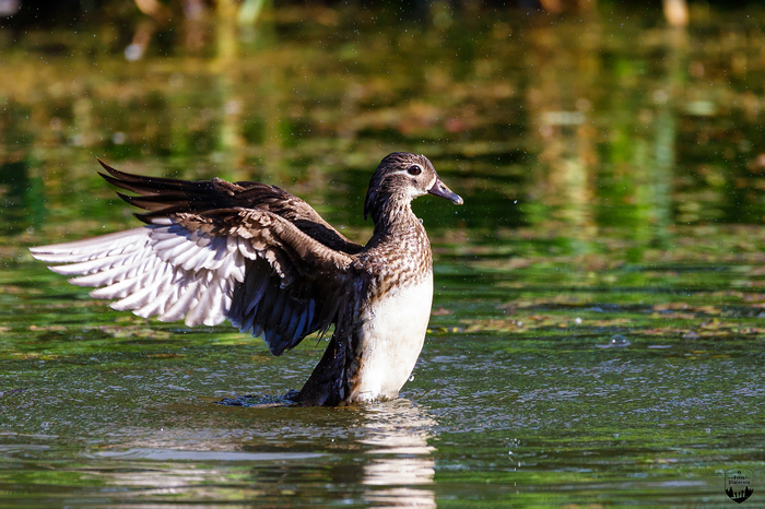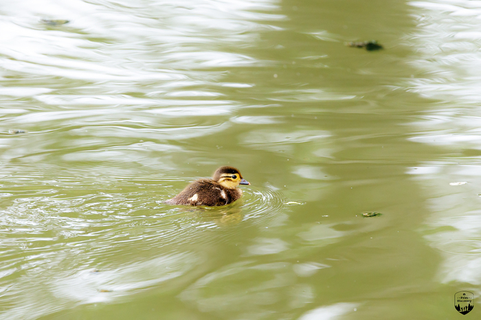 Сейчас для мандаринок настало тяжелое время - нужно выхаживать птенцов, следить за ними. Мы стали свидетелями, как мама-утка обучала своих птенцов чистоплотности. Она заныривала под воду, резко вытаскивала из неё голову и делала все заново. После, приподнявшись над водой, махала крыльями. Птенцы чуть позже стали делать то же самое. Только вот с крыльями беда - не такие они оперившиеся. Взъерошенный утенок больше похож на общипанного.