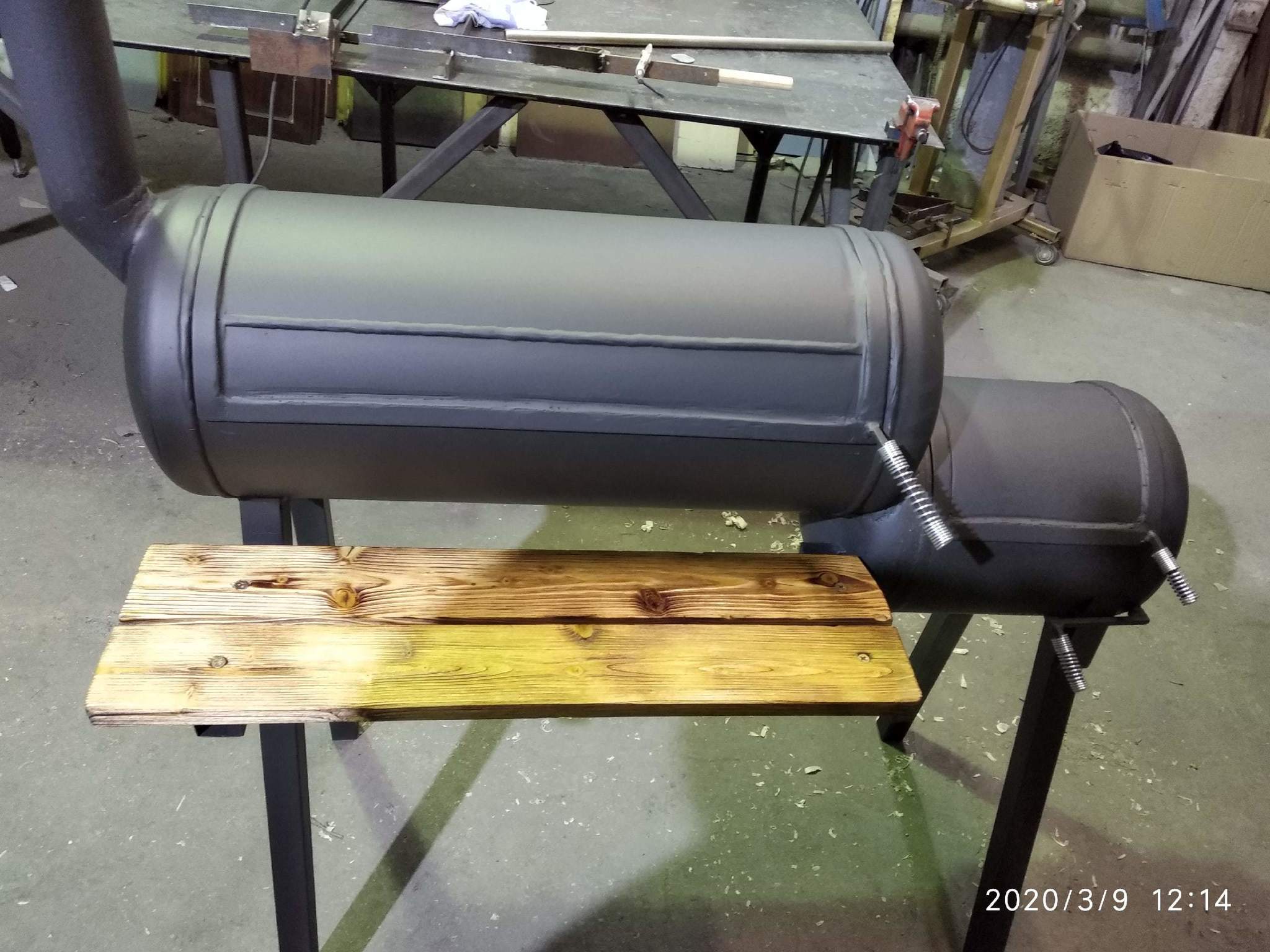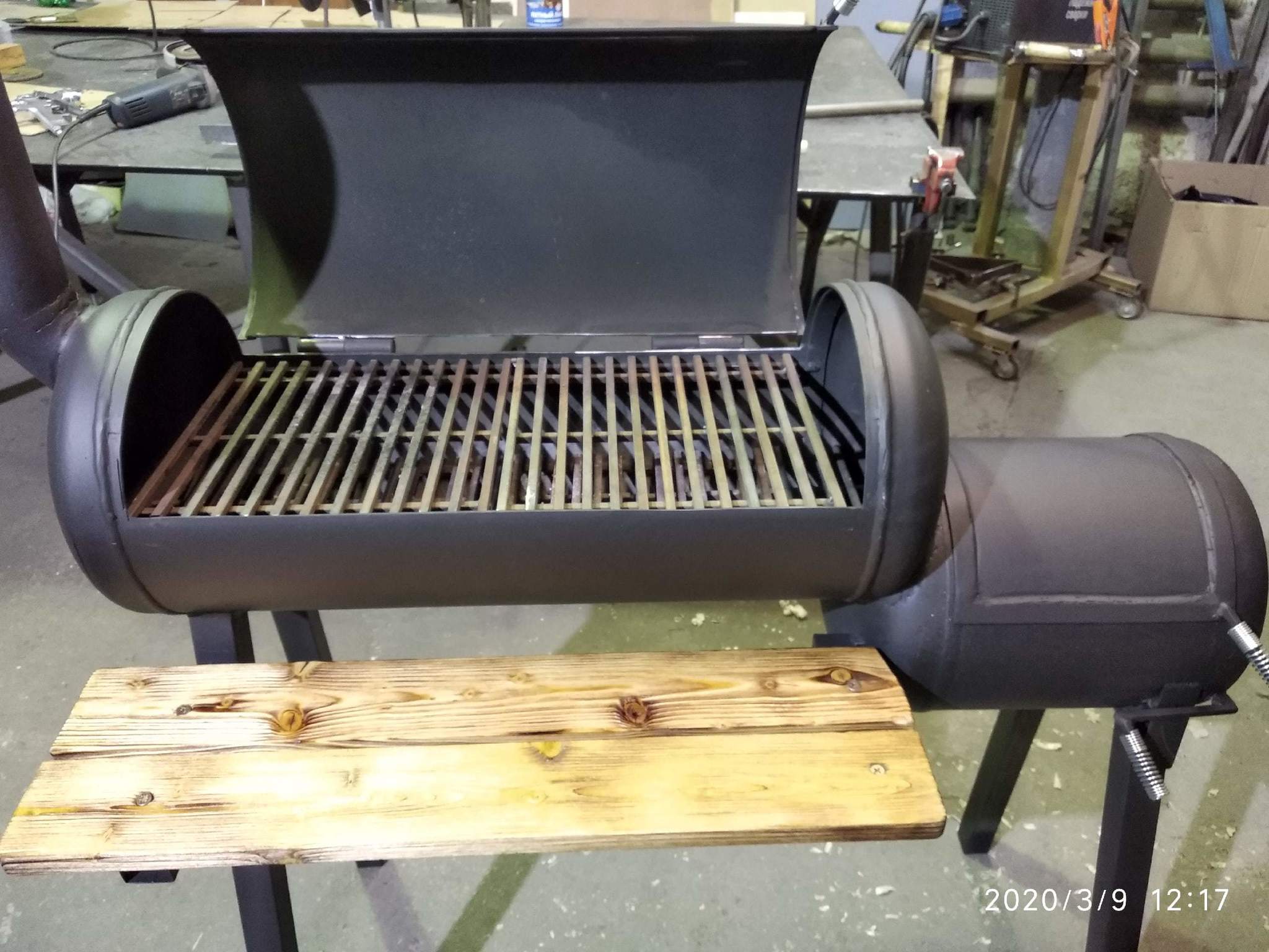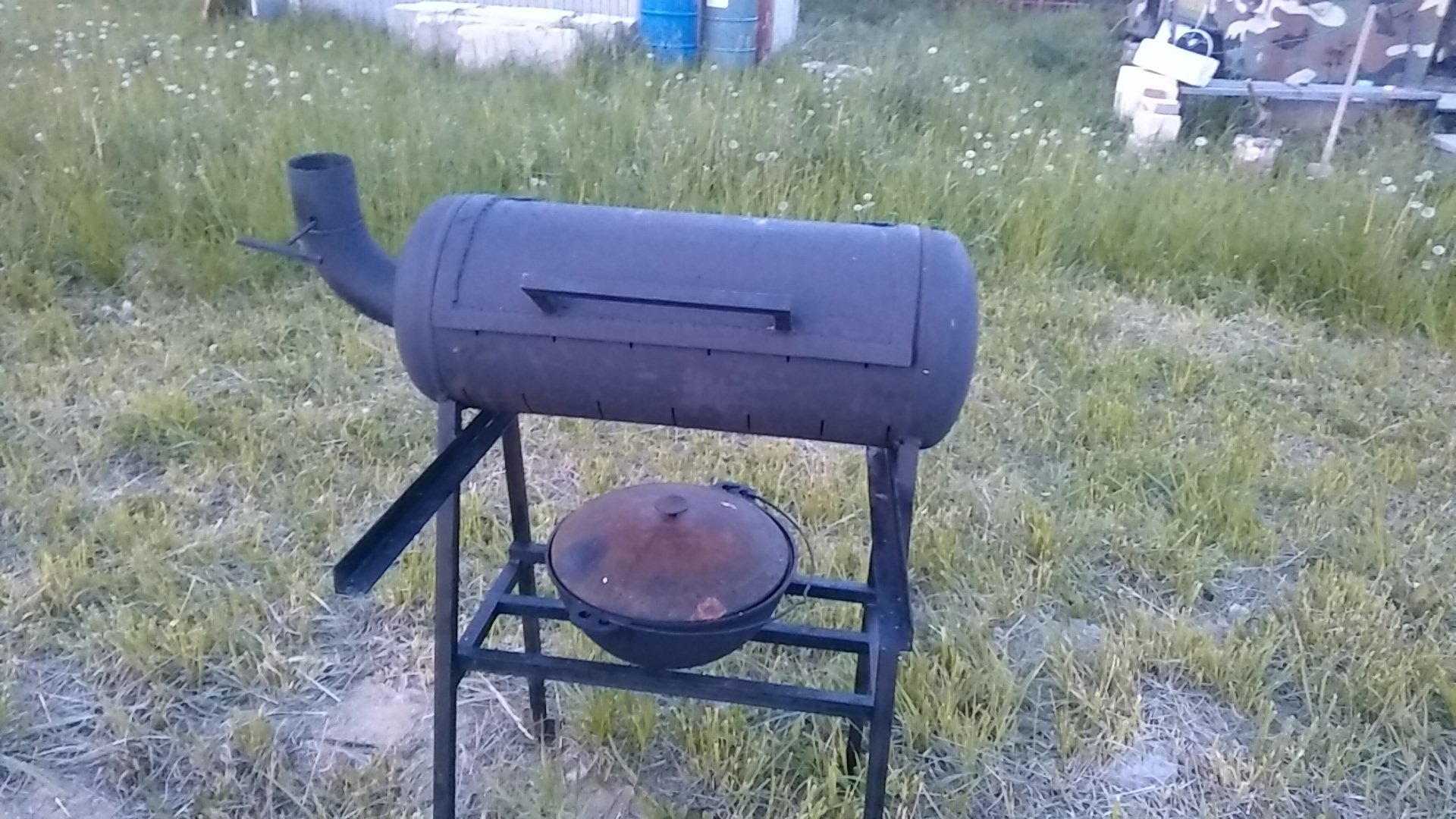 На все про все заняло три дня неспешной, в удовольствие, работы. Вдохновлялся, само собой, ютубом. По затратам вышло немного, баллоны с рук дешёвые на 50л и 27л, профили для ножек на металлопрокате купил, болгарку и сварочник у друзей отдолжил. Плюс расходники итого: 50 баксов. Плюс минус. Некоторые конструктивные особенности я опустил из-за отсутствия материалов, но и так норм. Колосниковую решетку для мелкого отделения сделал из нижней "юбки" самого баллона и навареных на нее арматуры. Снизу вырезал небольшой конус, приварил к гайке, посадил на болт, получилось регулируемое поддувало. Ножки кривоваты получились, но это усталость под конец второго дня сказалась. Ну и отсутствие усидчивости. Вещь тяжеленная, тягать каждый раз не вариант, скорей всего посадим на цепь, а на зиму в сарай.