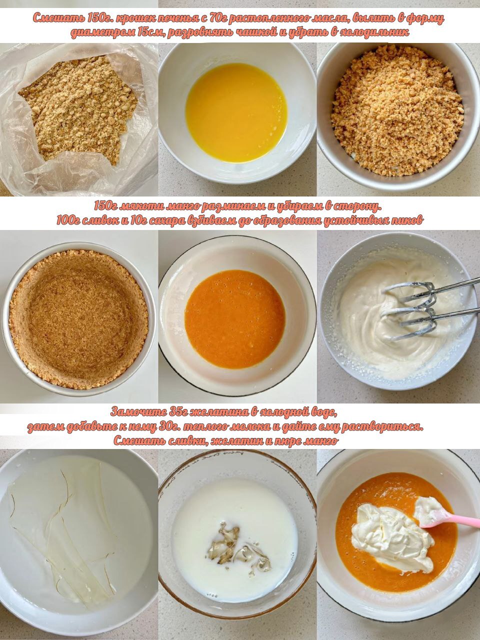 • Приготовление мангового мусса: Взбейте 100 г сливок с 10 г сахара до образования устойчивых пиков. Замочите 15 г желатина в холодной воде, затем растопите в 30 г теплого молока. Смешайте взбитые сливки, желатиновую жидкость и 150 г мякоти манго. Хорошо перемешайте.