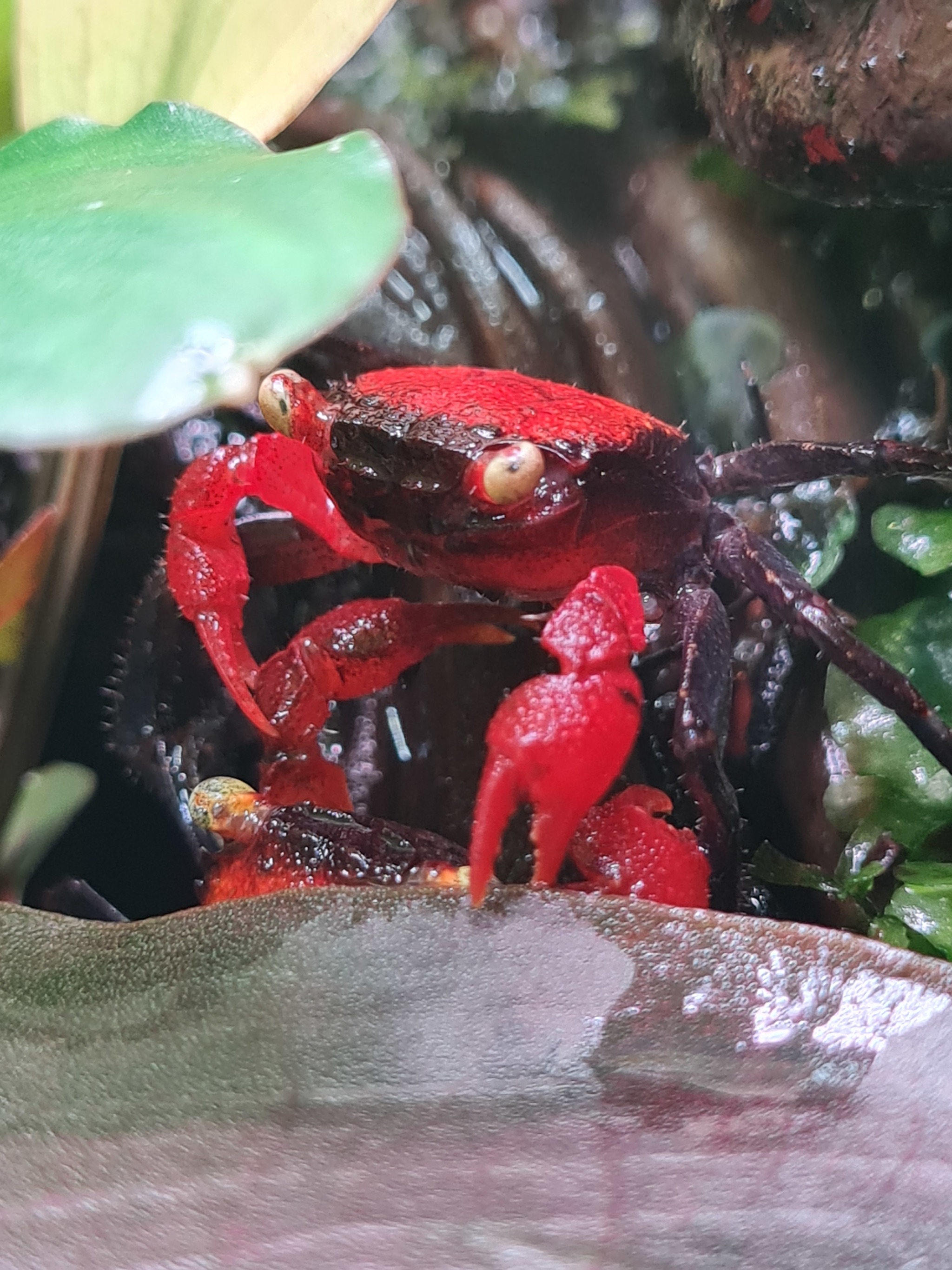 Это не мангровые крабы, а крабы Geosesarma, под торговыми названиями красный дьявол (красные клешни) и вампир (фиолетовые клешни). Мангровые из того же семейства Sesarmidae, но род у них разный. Основное отличие - у геосесарм вылупляется из икры готовый к жизни крабик. У мангровых вылупляется личинка с солоноводной стадией развития, их в домашних условиях почти нереально размножить.